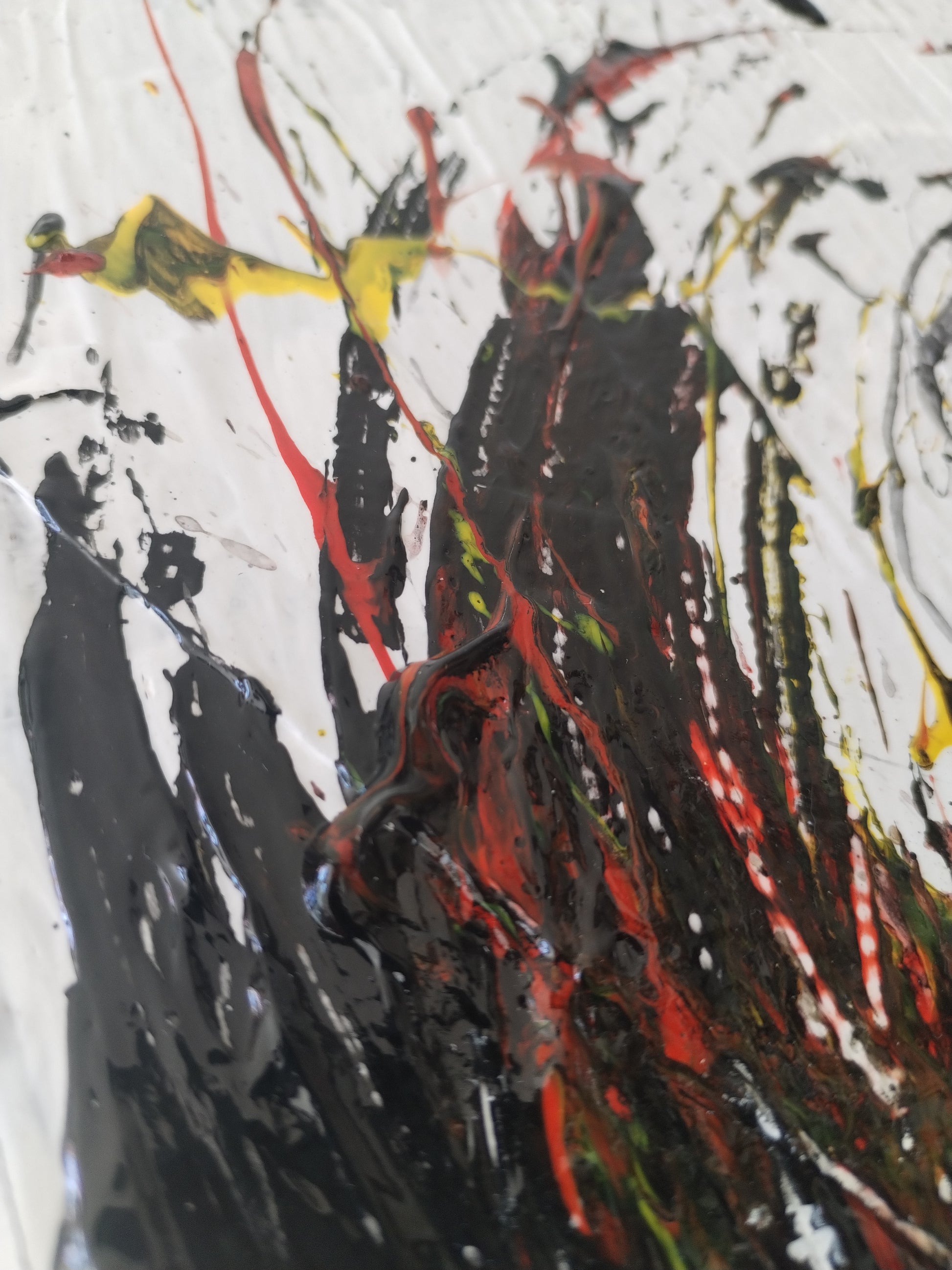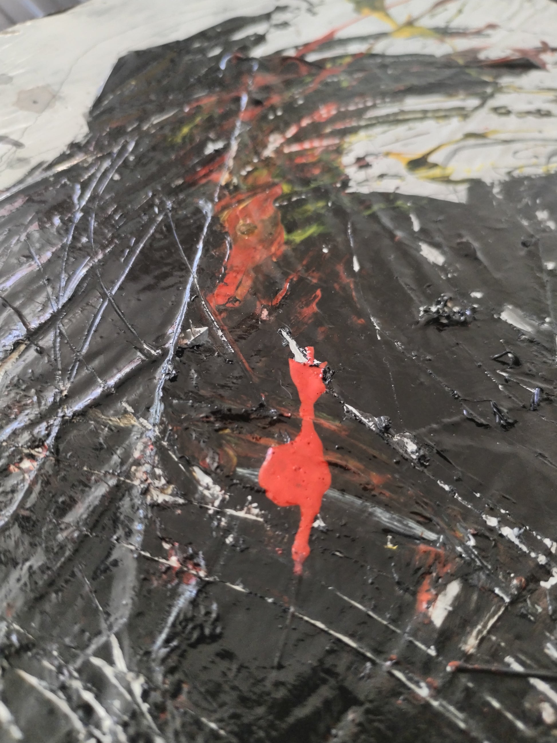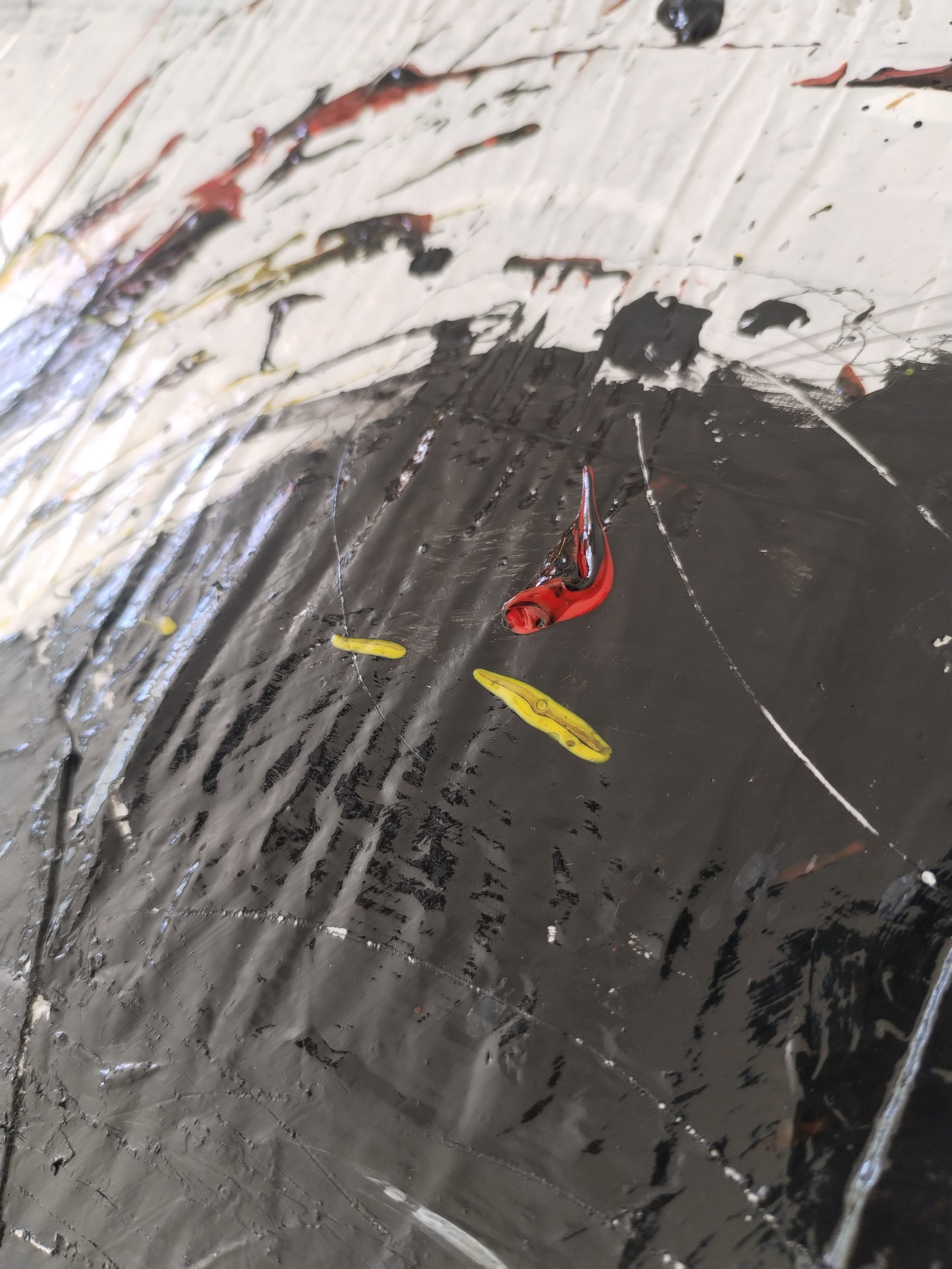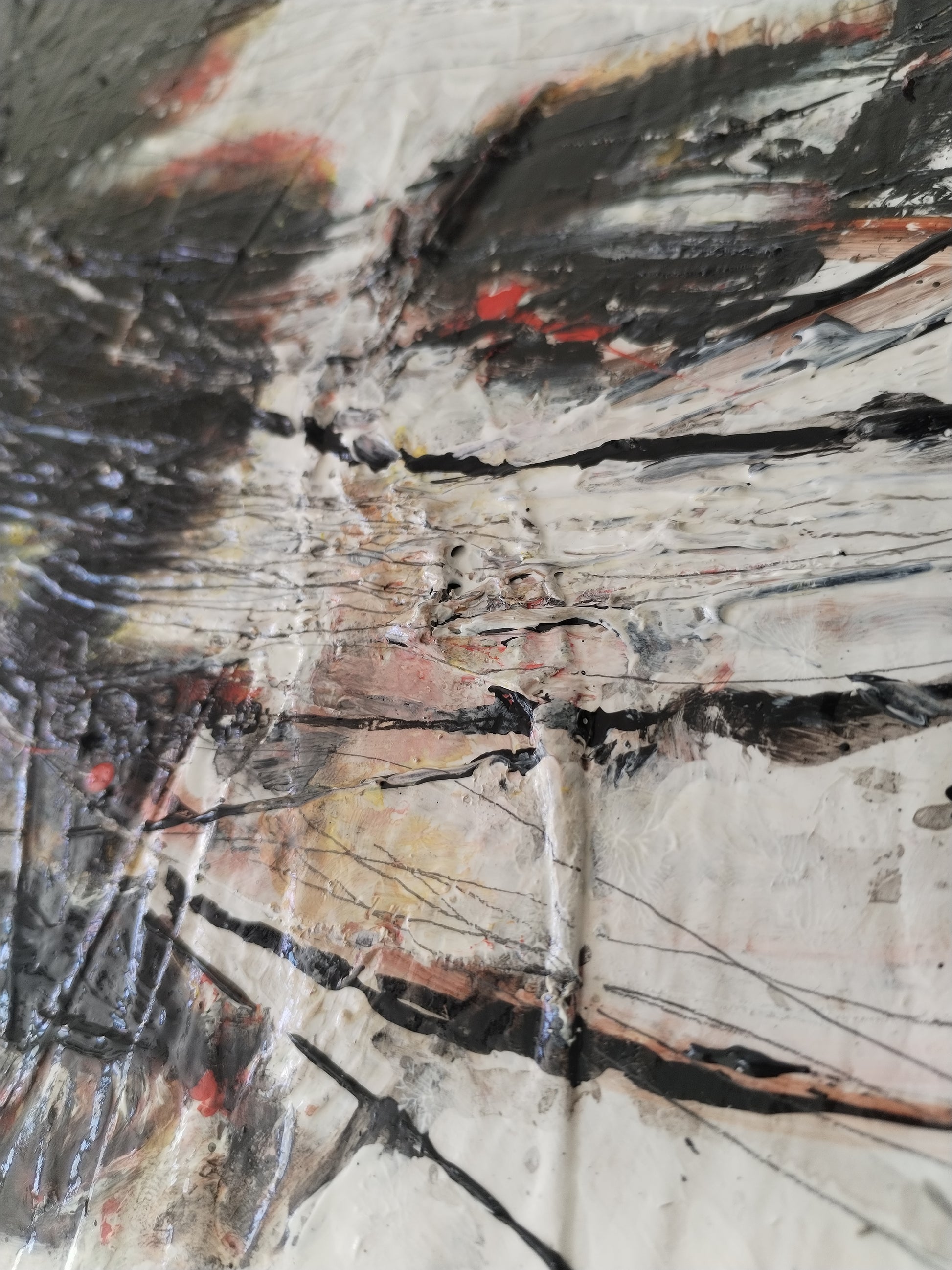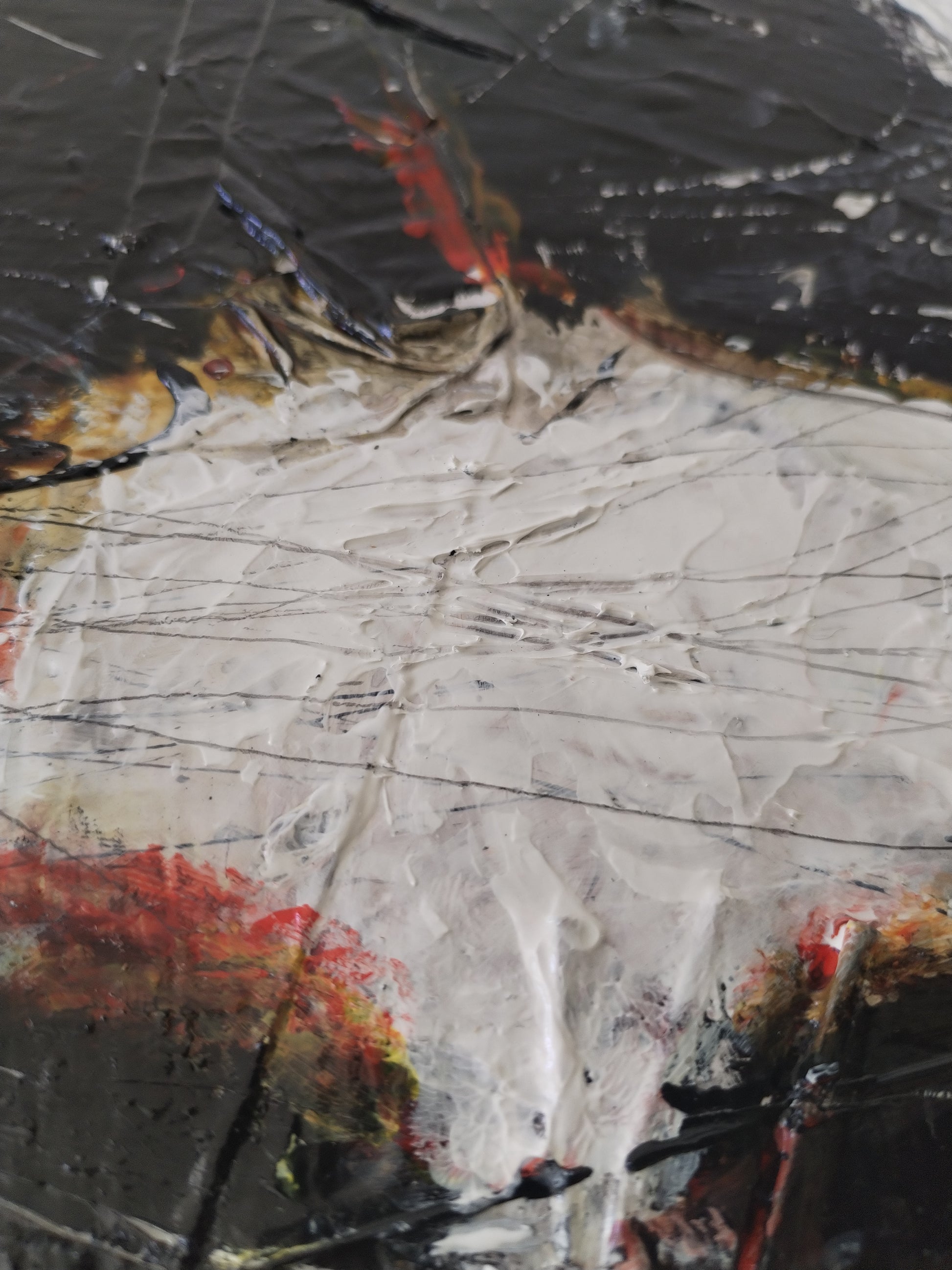 Il rosso del colletto, vibrante e deciso, contrasta con la monocromia dello sfondo, diventando simbolo di energia, identità, o forse resistenza. La pittura acrilica, densa e materica, si mescola a gesti istintivi, schizzi, graffi e linee solo accennate, in un equilibrio tra il controllo e l’imprevisto.