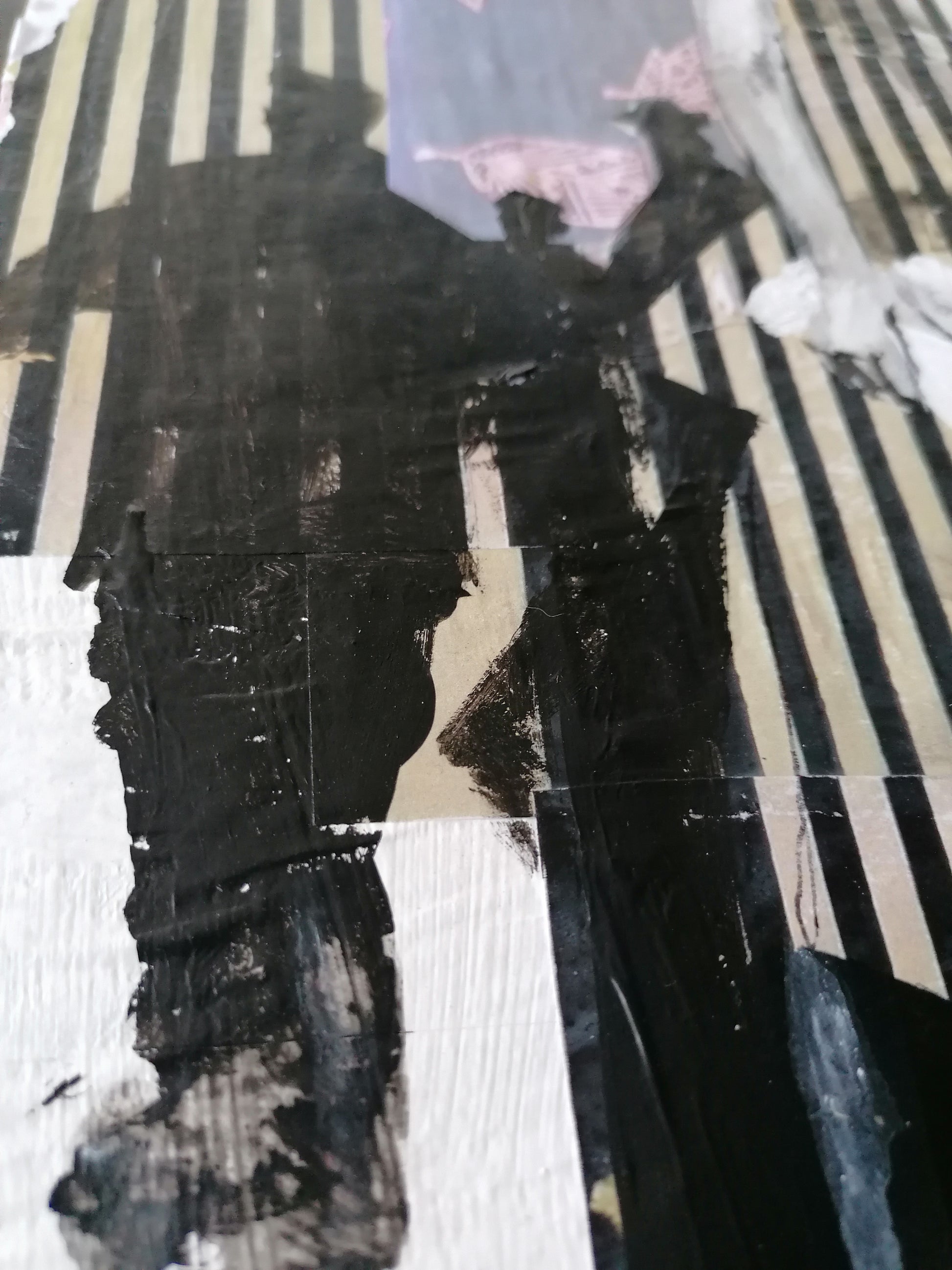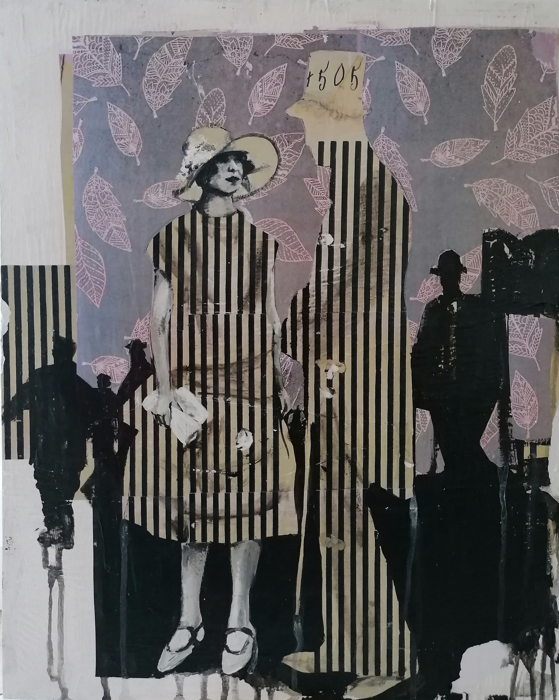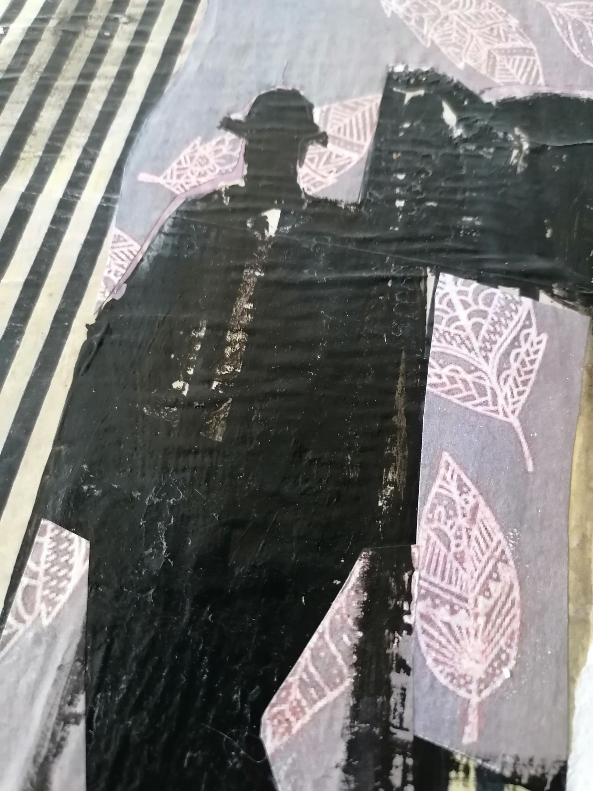 Un uomo indefinito e una donna vestiti di strisce, si stanno sposando. I testimoni all'evento sono macchie nere che si muovono su uno sfondo di foglie al vento..caduci e instabili come il matrimonio?