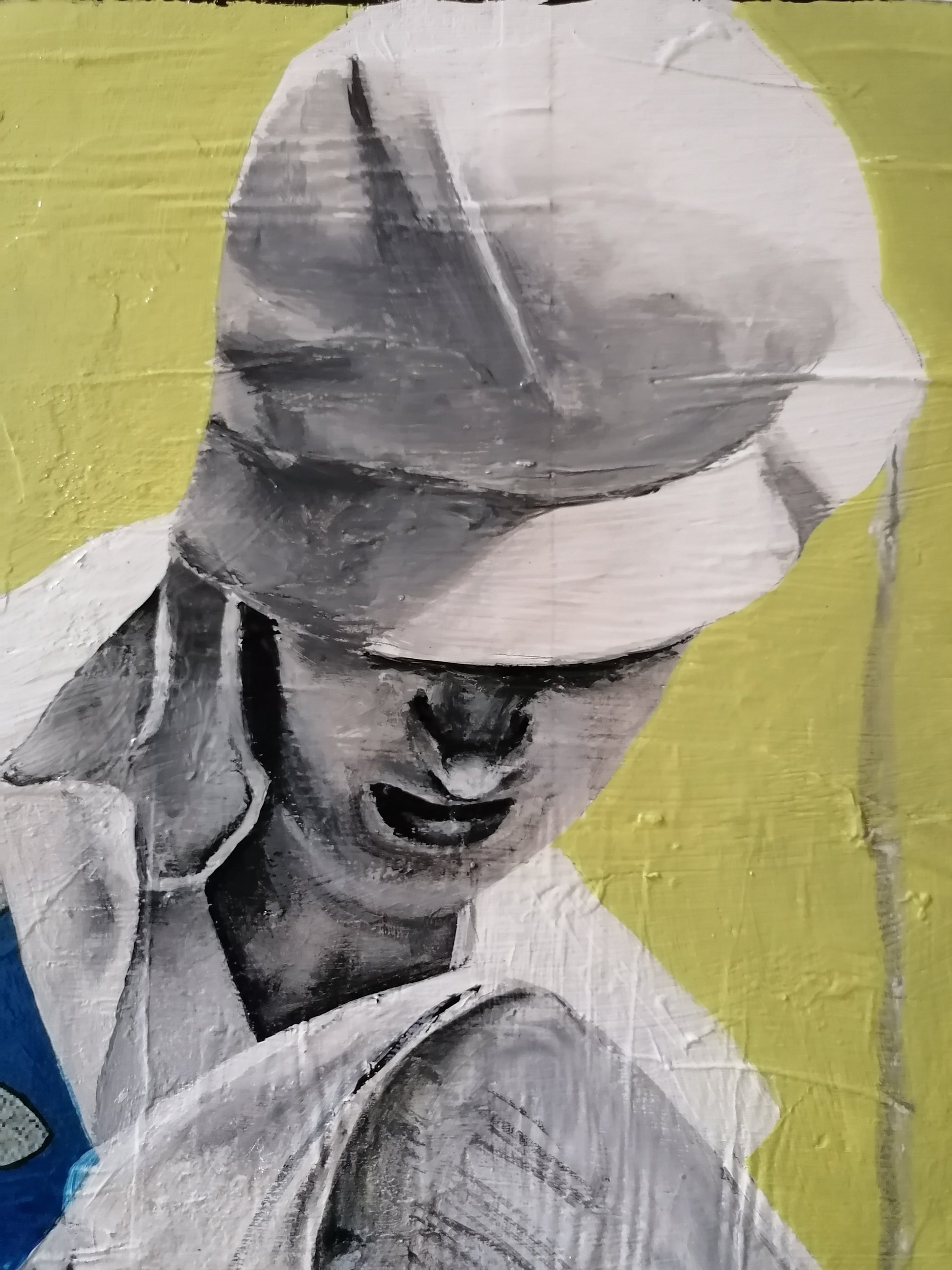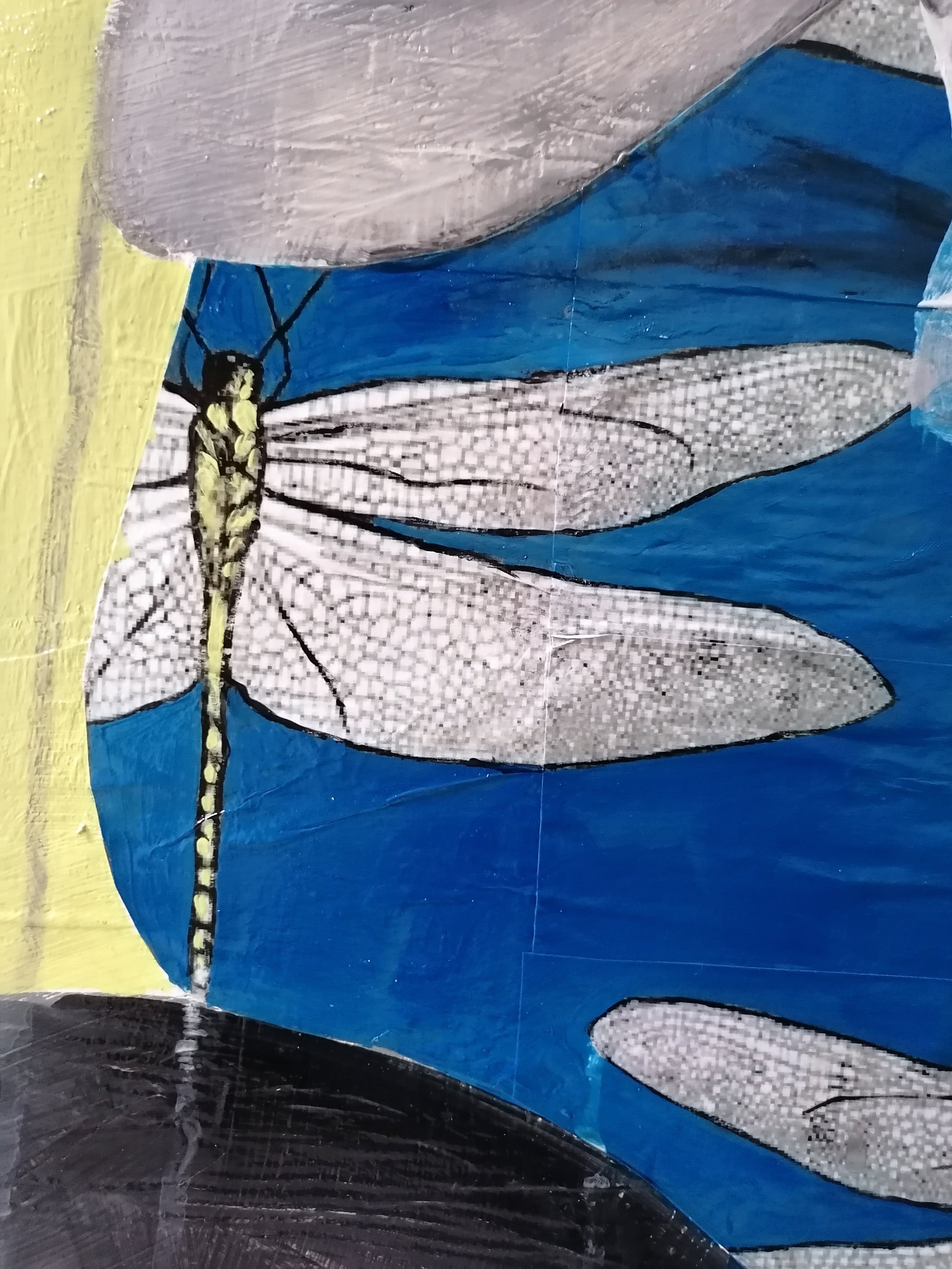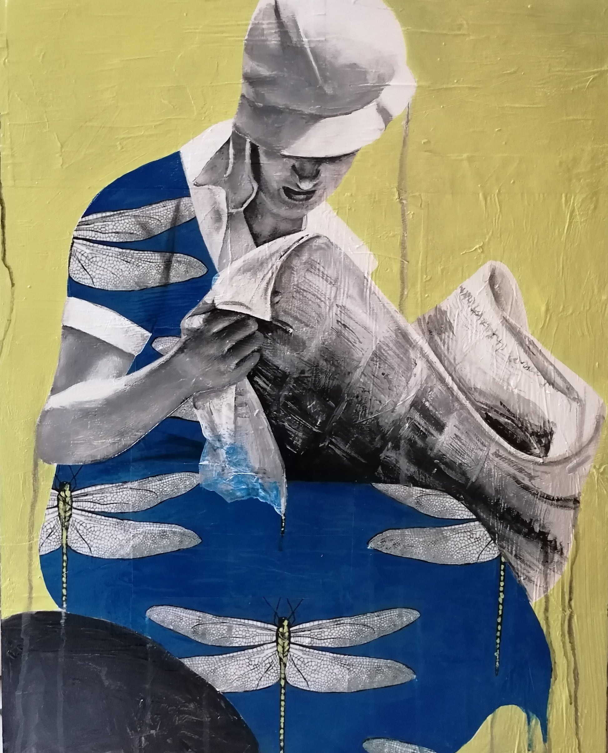 Il dipinto è realizzato con una tecnica mista :sull'abito della donna ho applicato una carta decorativa vintage mentre il resto dell'opera è dipinta in acrilico. Ho utilizzato una vernice lucida trasparente protettiva.