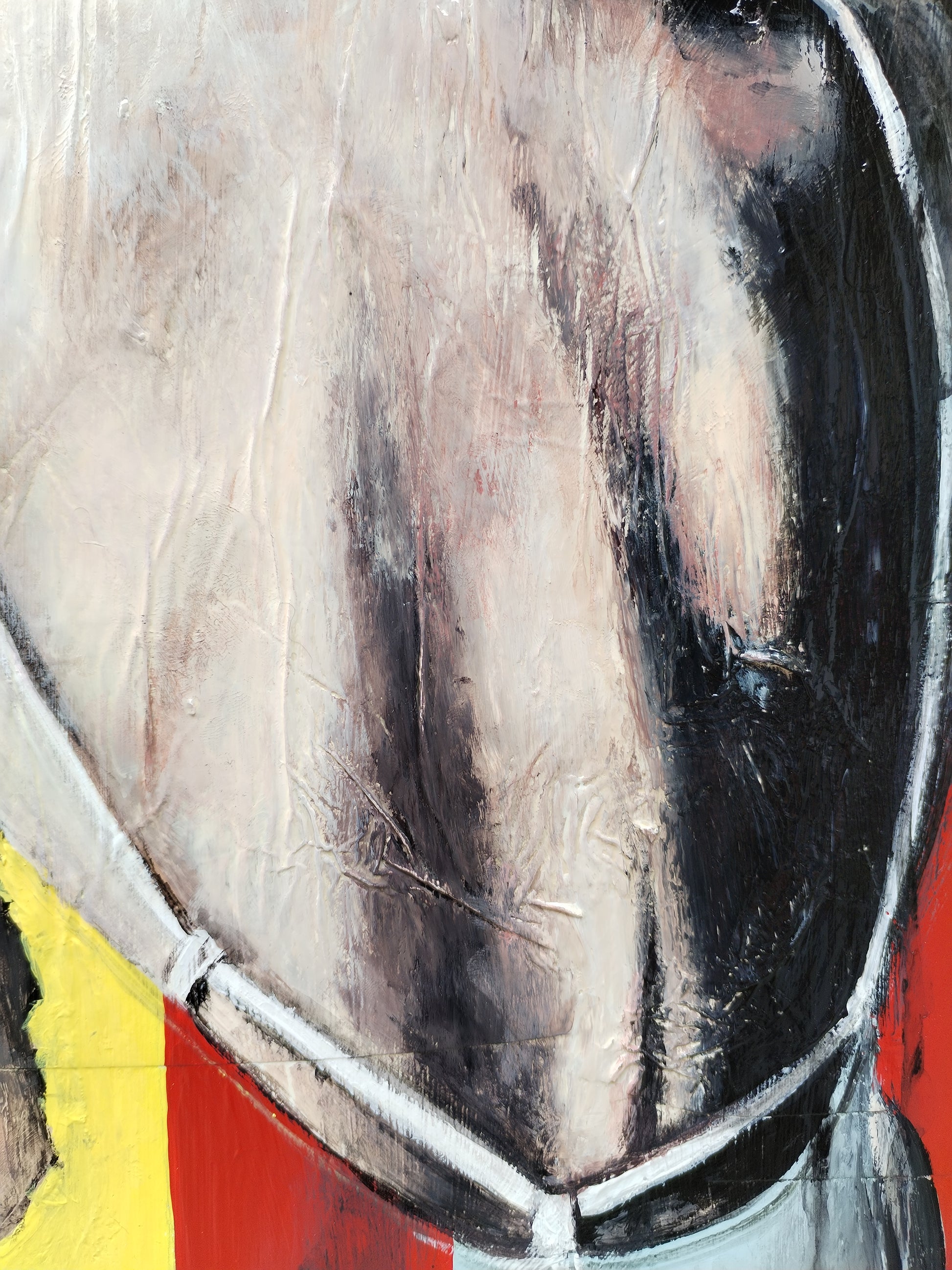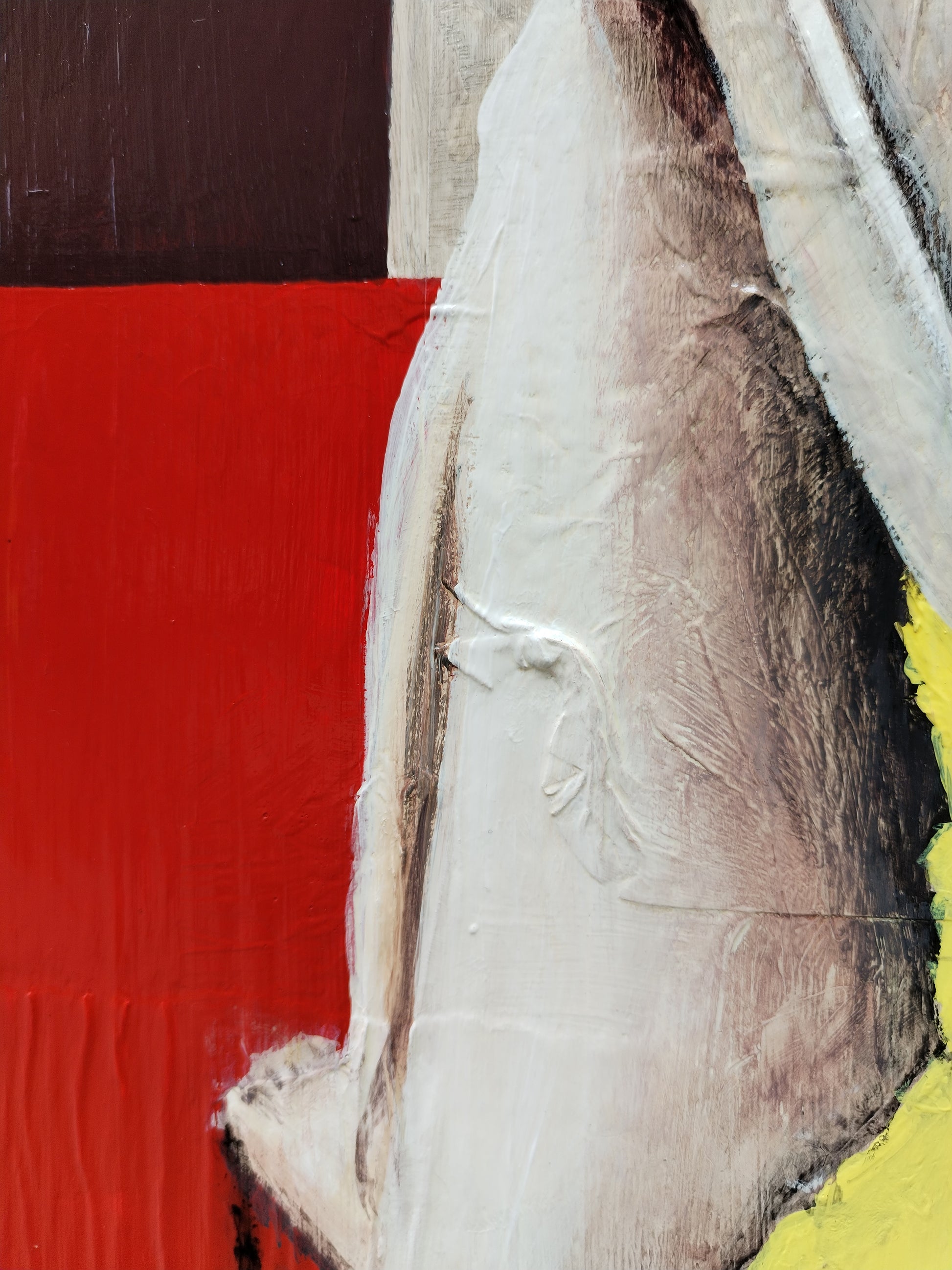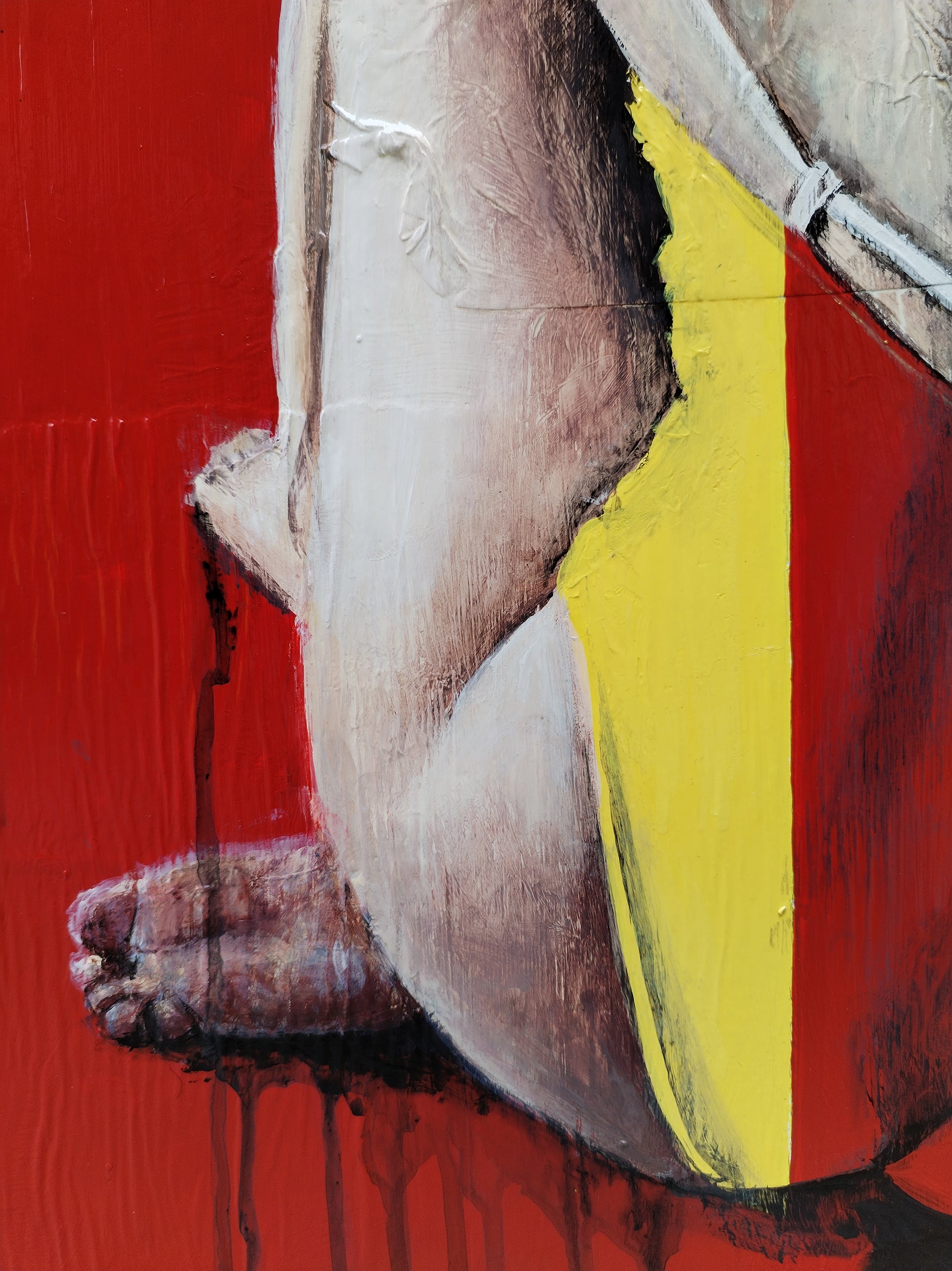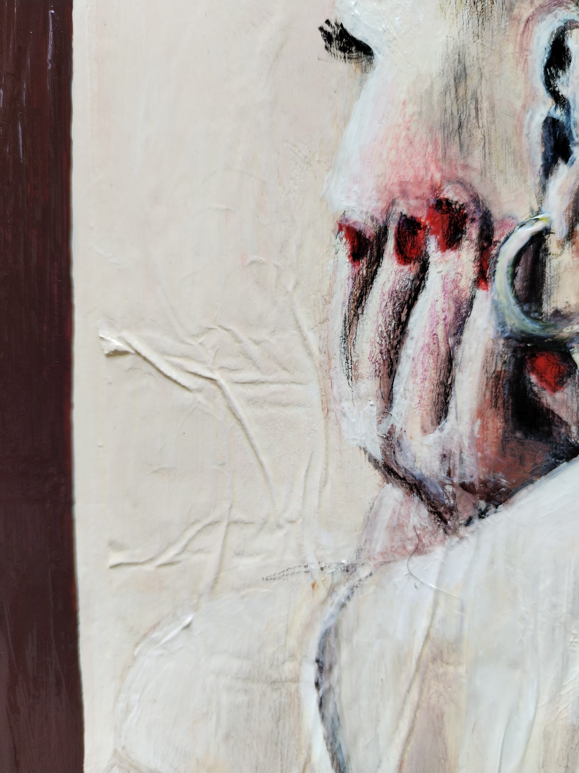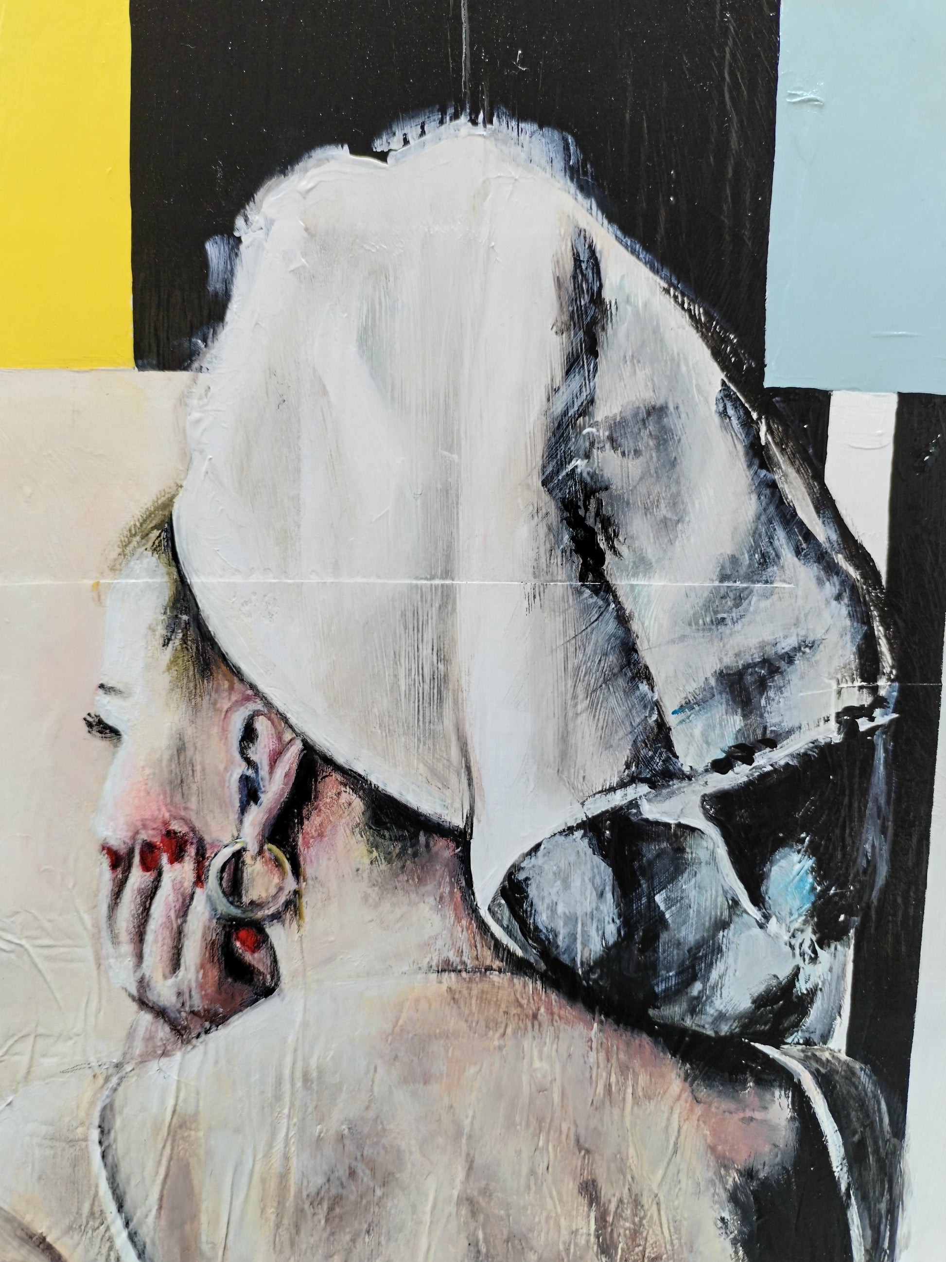 L'opera è realizzata con una tecnica mista, carta e acrilico su legno. Ho realizzato un collage di base sul supporto, creato tramite la sovrapposizione di pagine di giornale incollate con idropittura bianca. Successivamente ho dipinto il soggetto con acrilici, infine ho utilizzato una vernice trasparente lucida protettiva.