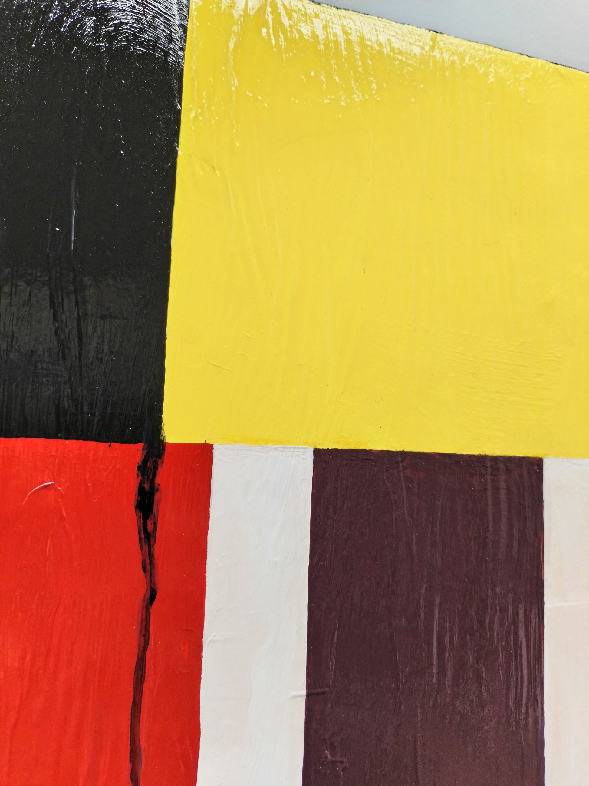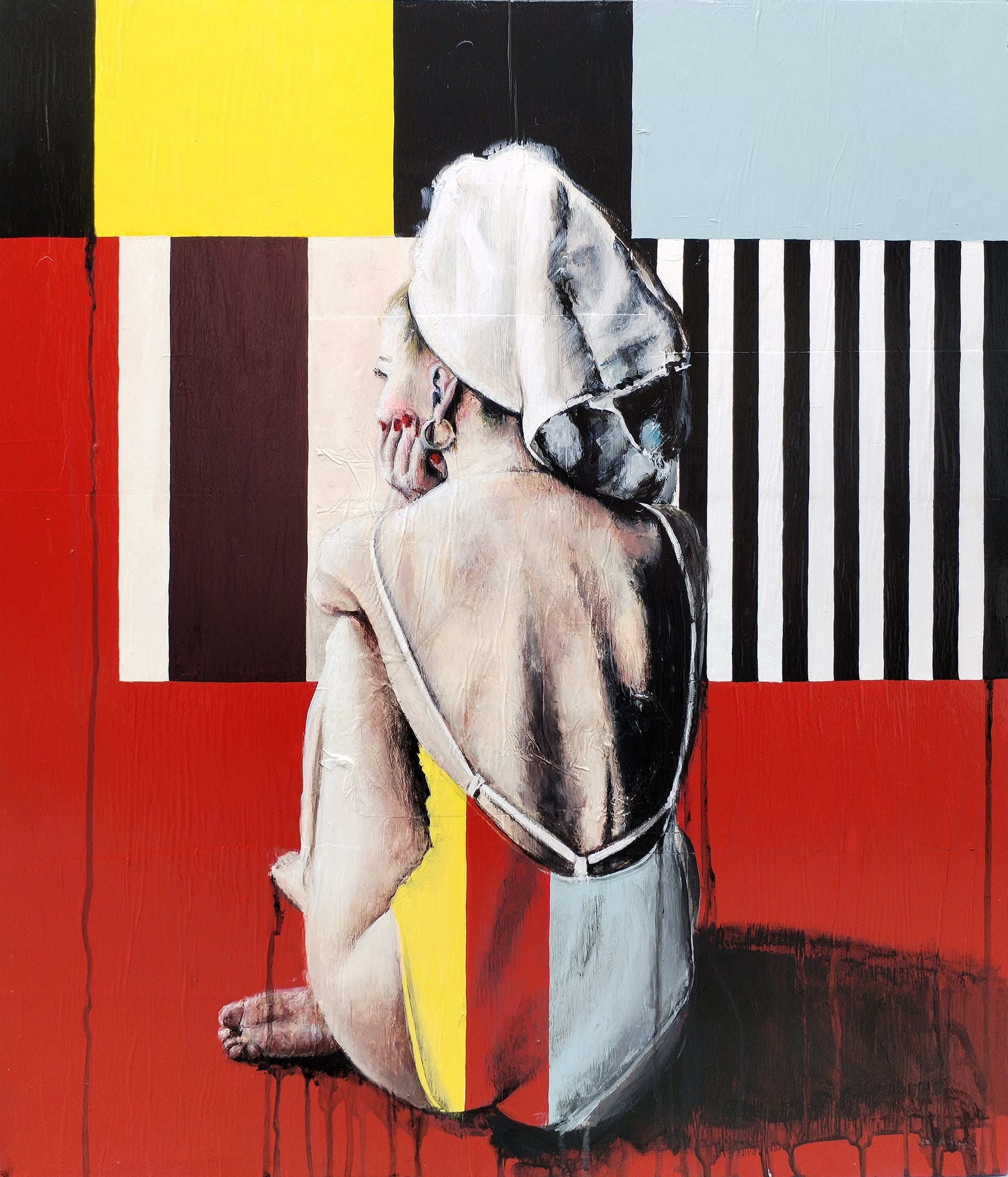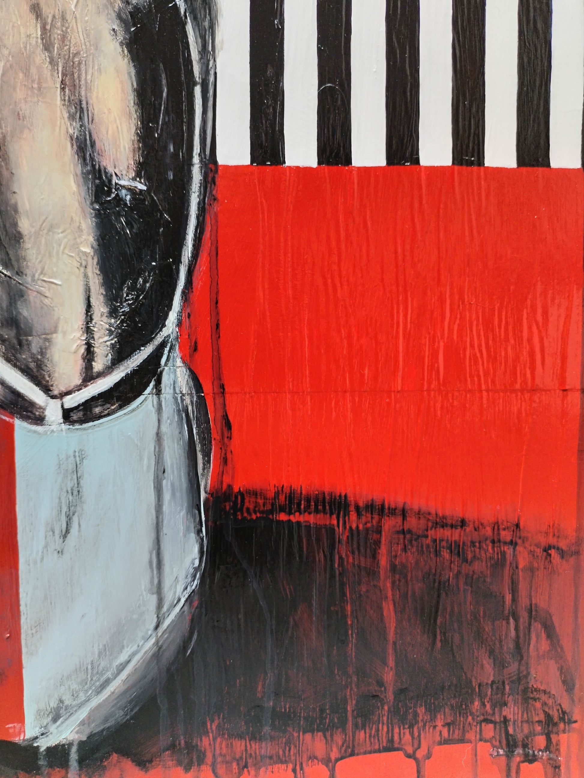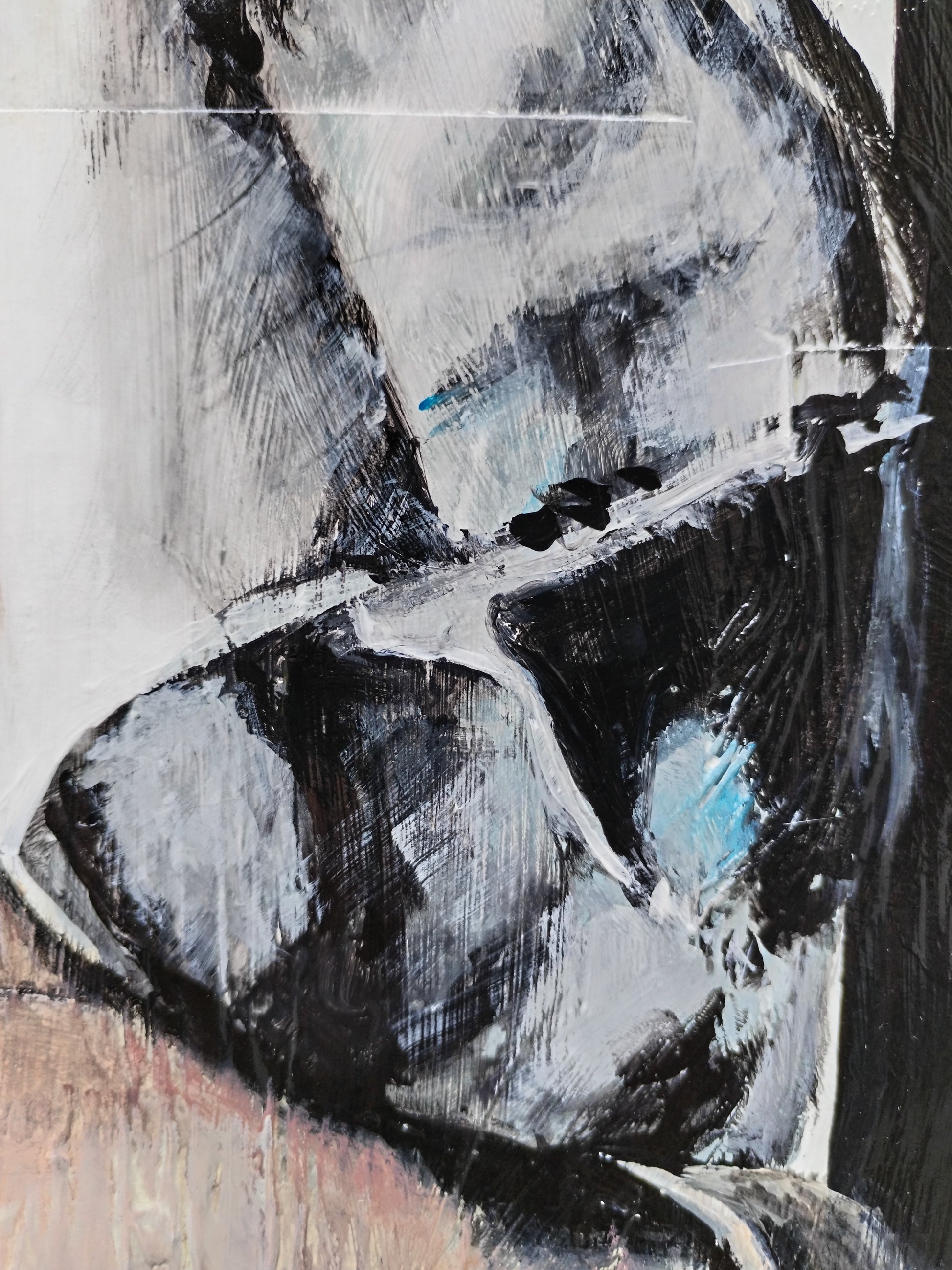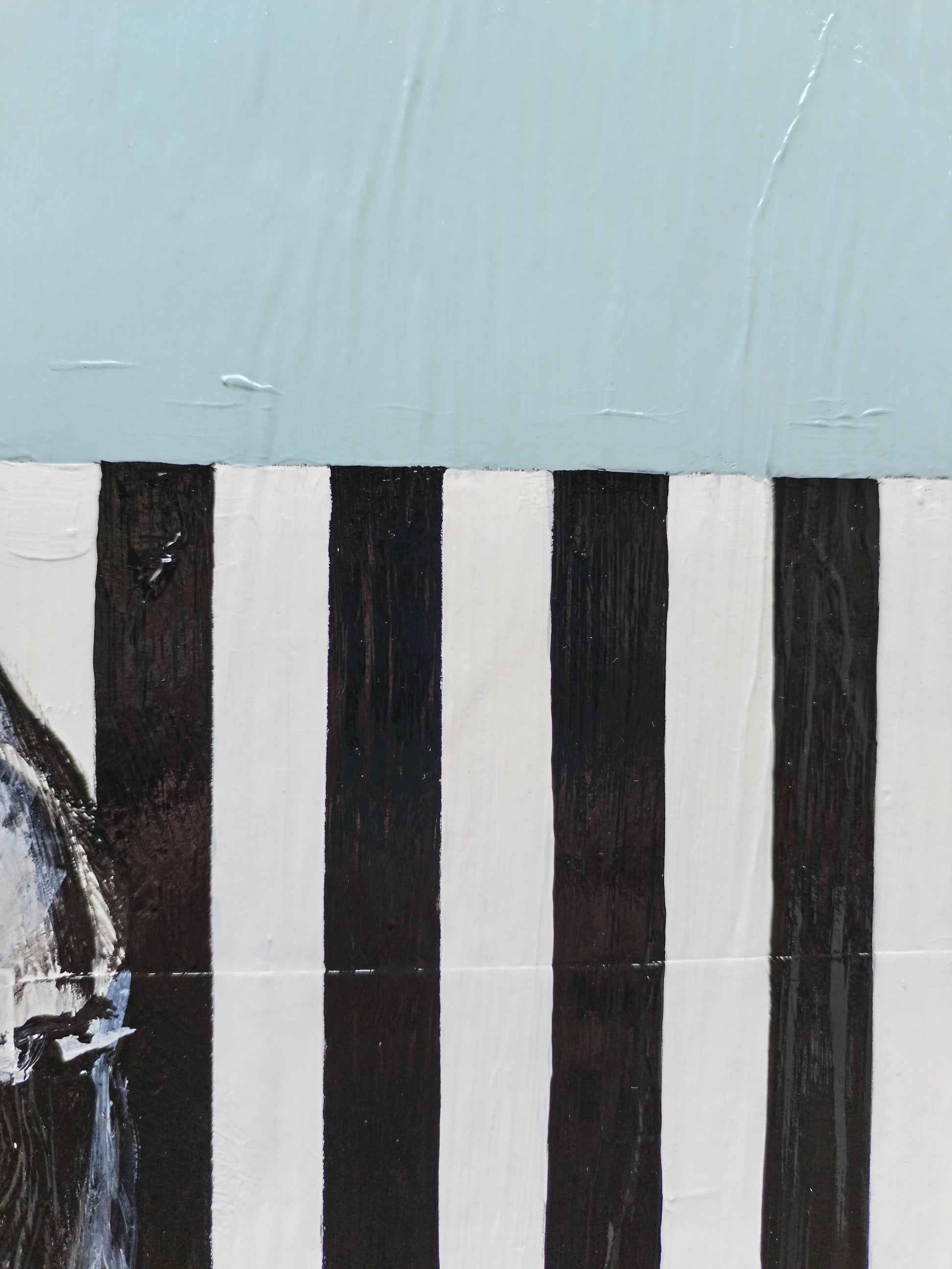 L'opera è realizzata con una tecnica mista, carta e acrilico su legno. Ho realizzato un collage di base sul supporto, creato tramite la sovrapposizione di pagine di giornale incollate con idropittura bianca. Successivamente ho dipinto il soggetto con acrilici, infine ho utilizzato una vernice trasparente lucida protettiva.