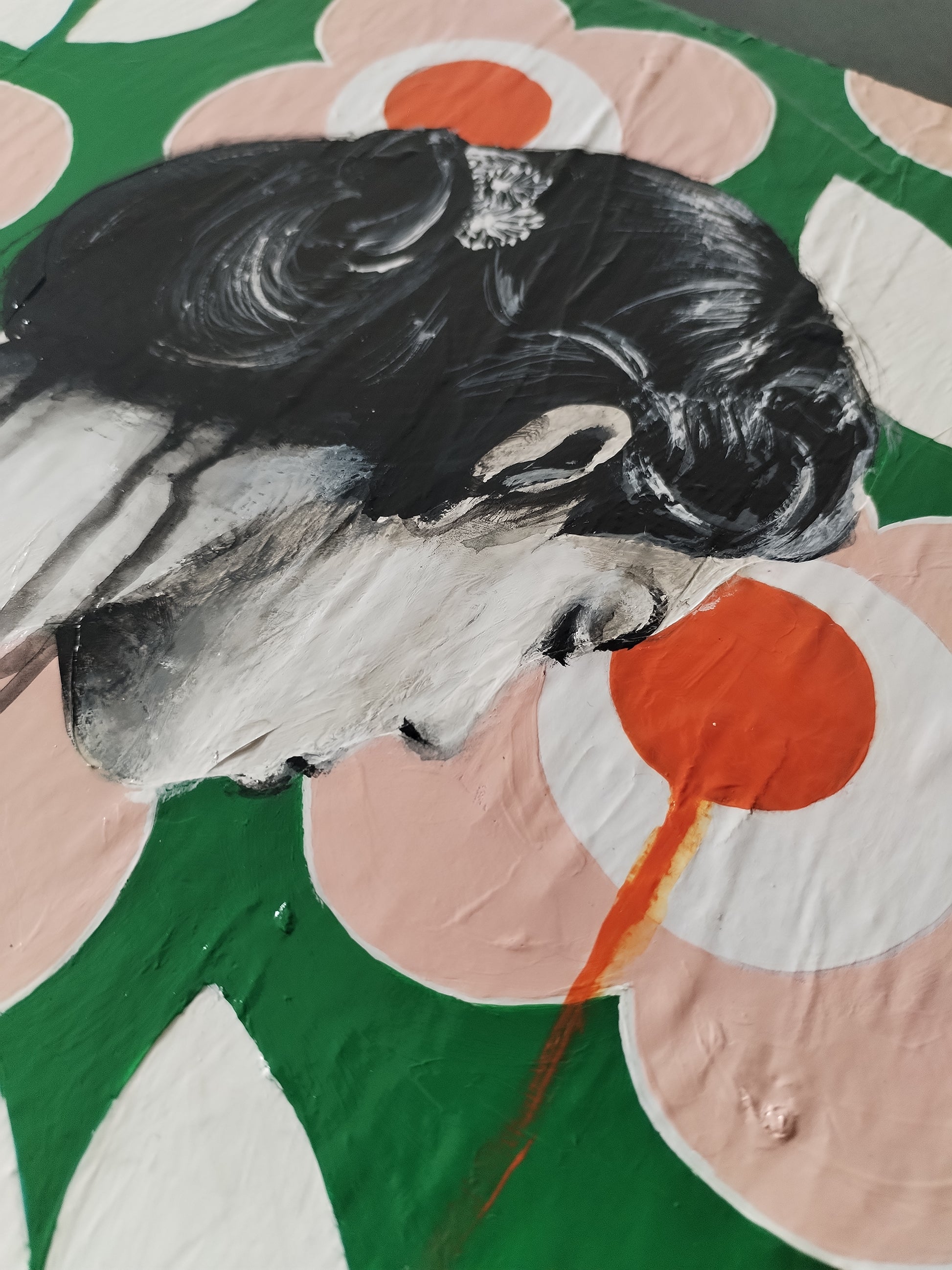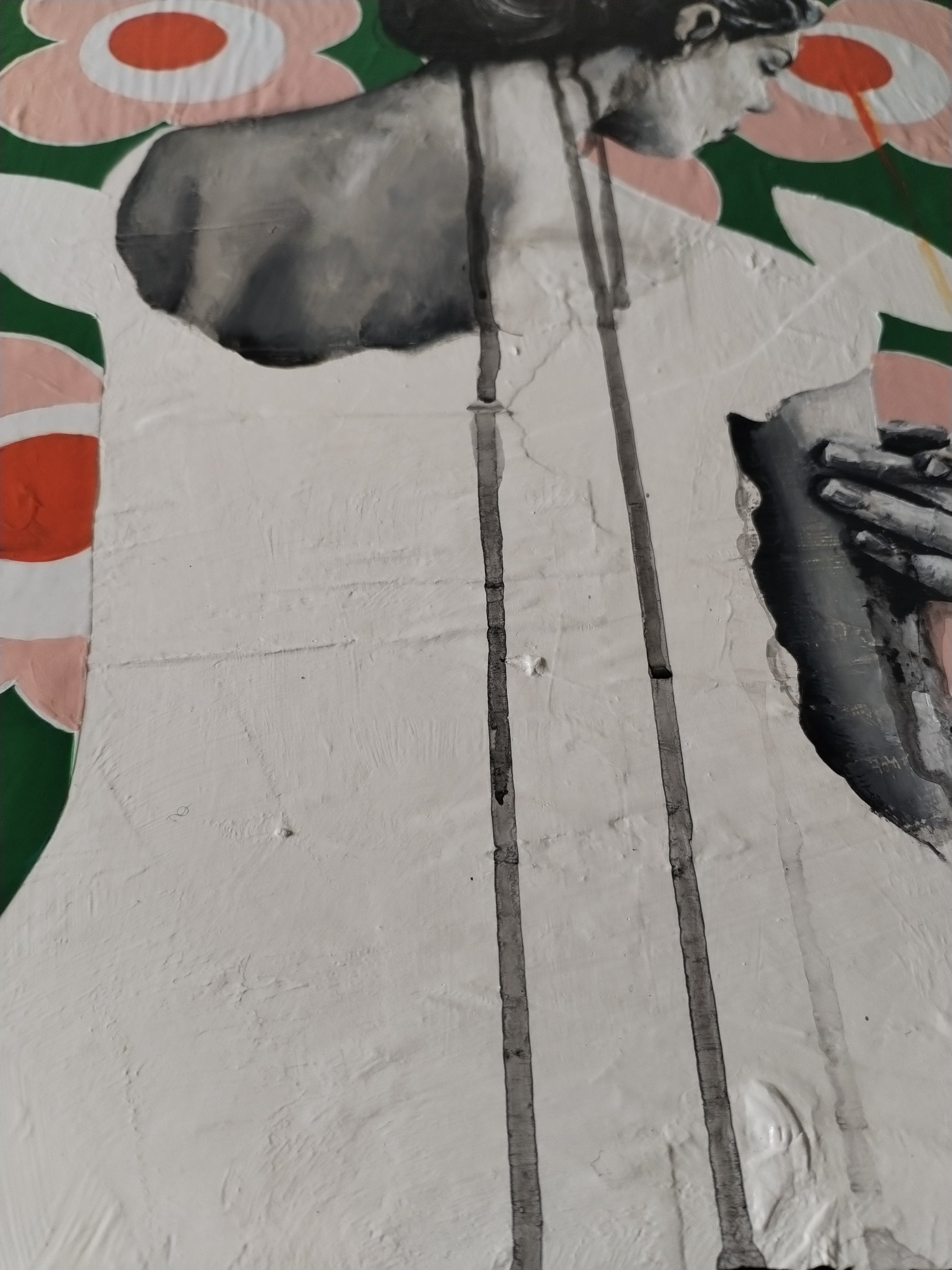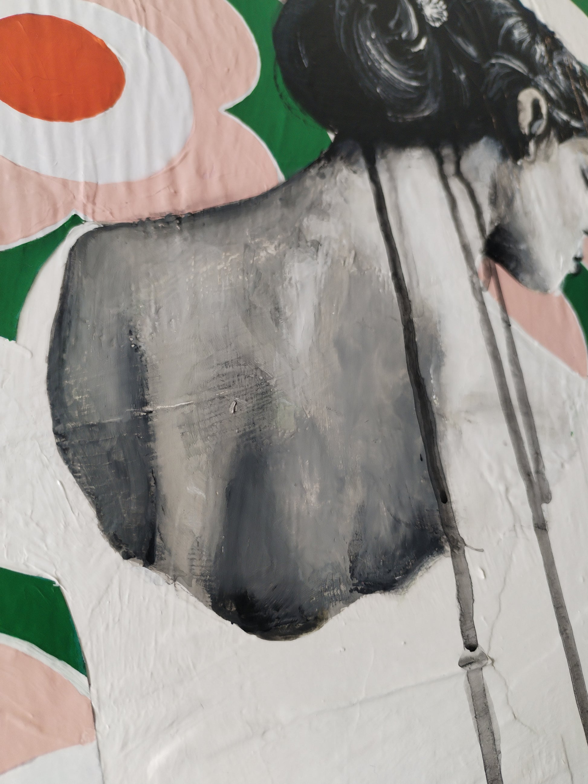 Questo lavoro raffigura una donna di schiena, in bianco e nero, avvolta da una uno sfondo floreale carico di colori accesi e vibranti.E' stato dipinto con una tecnica mista, acrilico e carta su tavola :ho realizzato un collage di base fatto di strati di carta da giornale sovrapposti, ho disegnato il soggetto, applicato una carta decorativa floreale sullo sfondo e dipinto il soggetto con acrilici. Infine ho utilizzato una vernice protettiva lucida trasparente.
