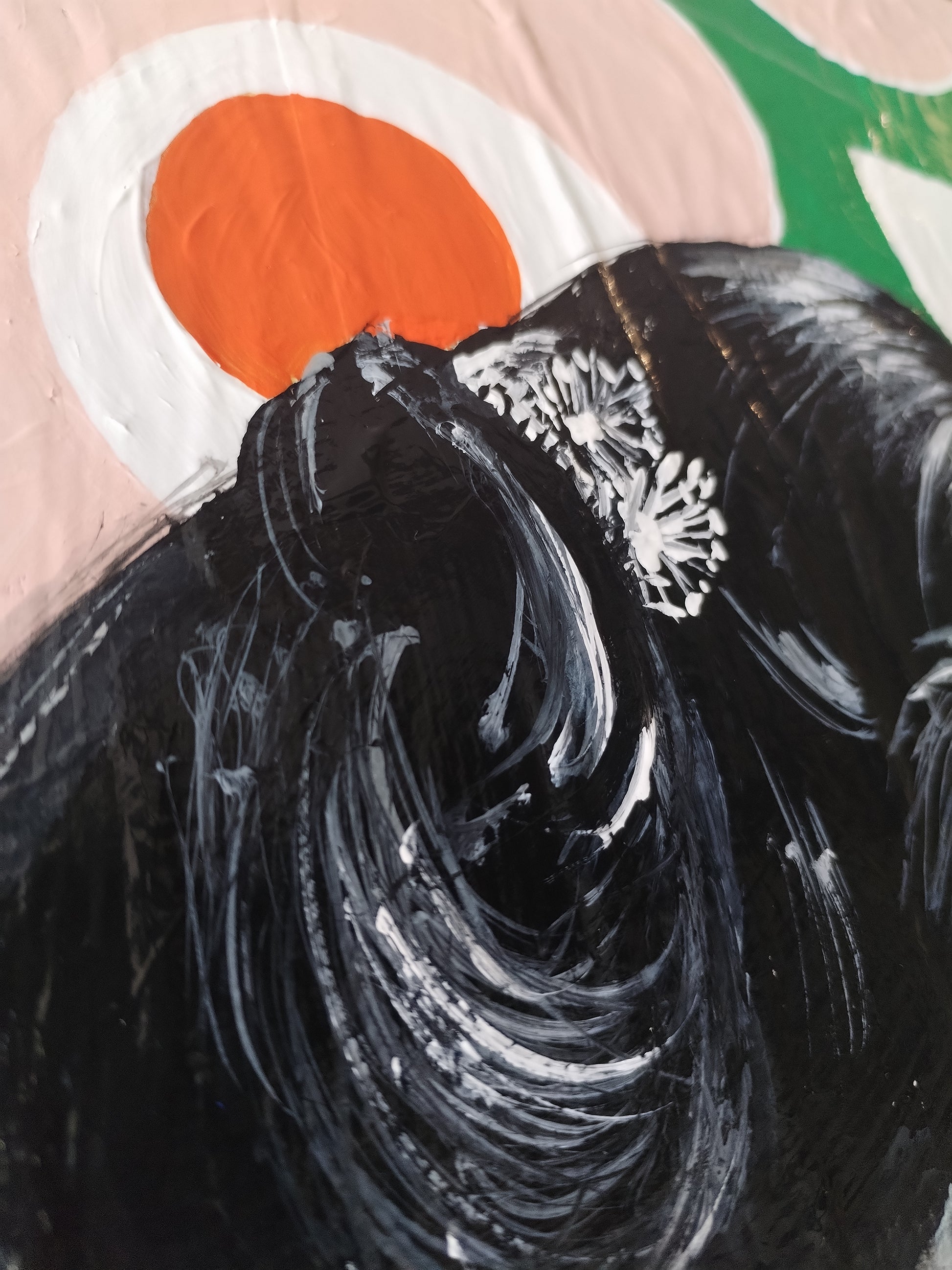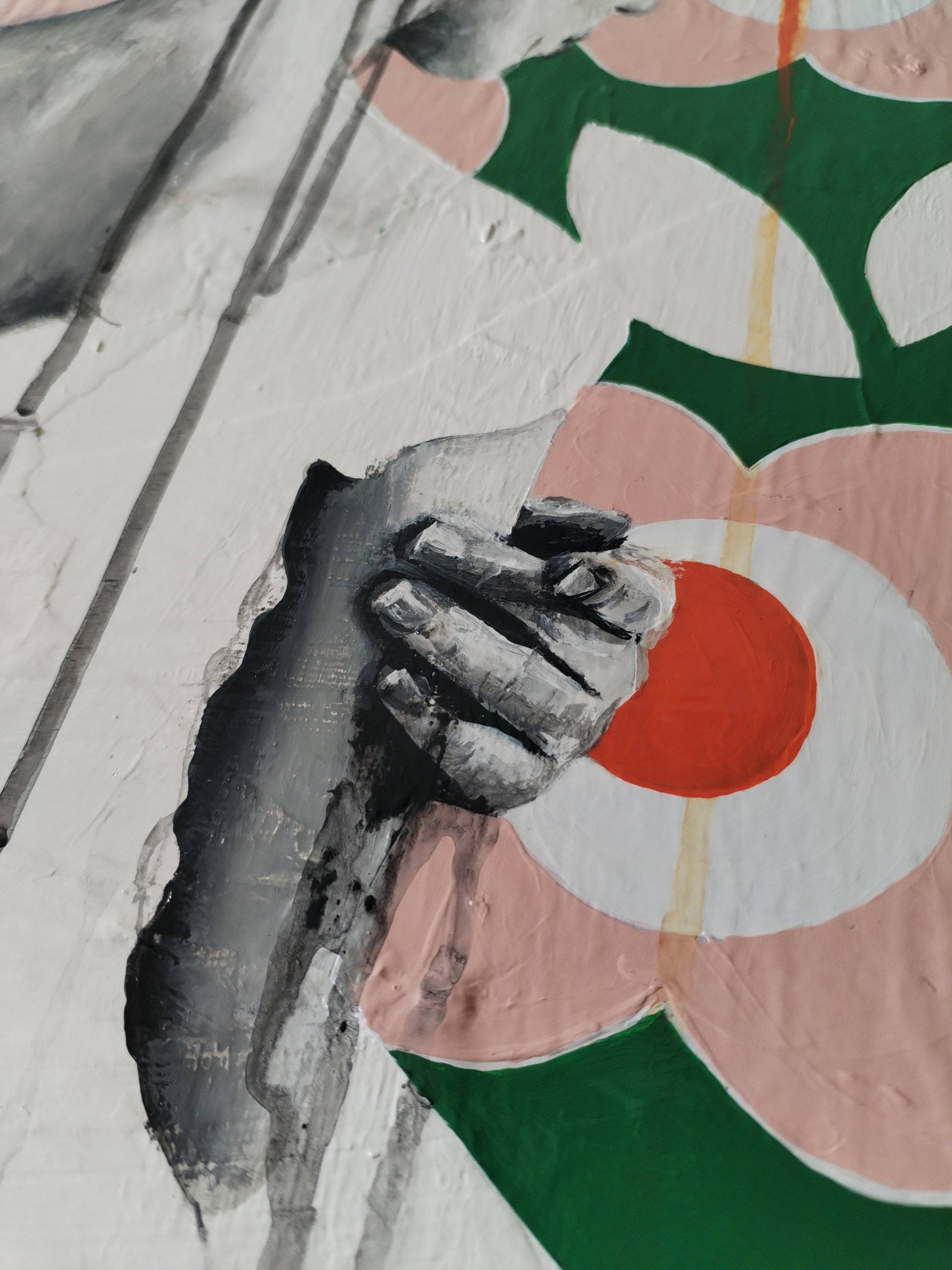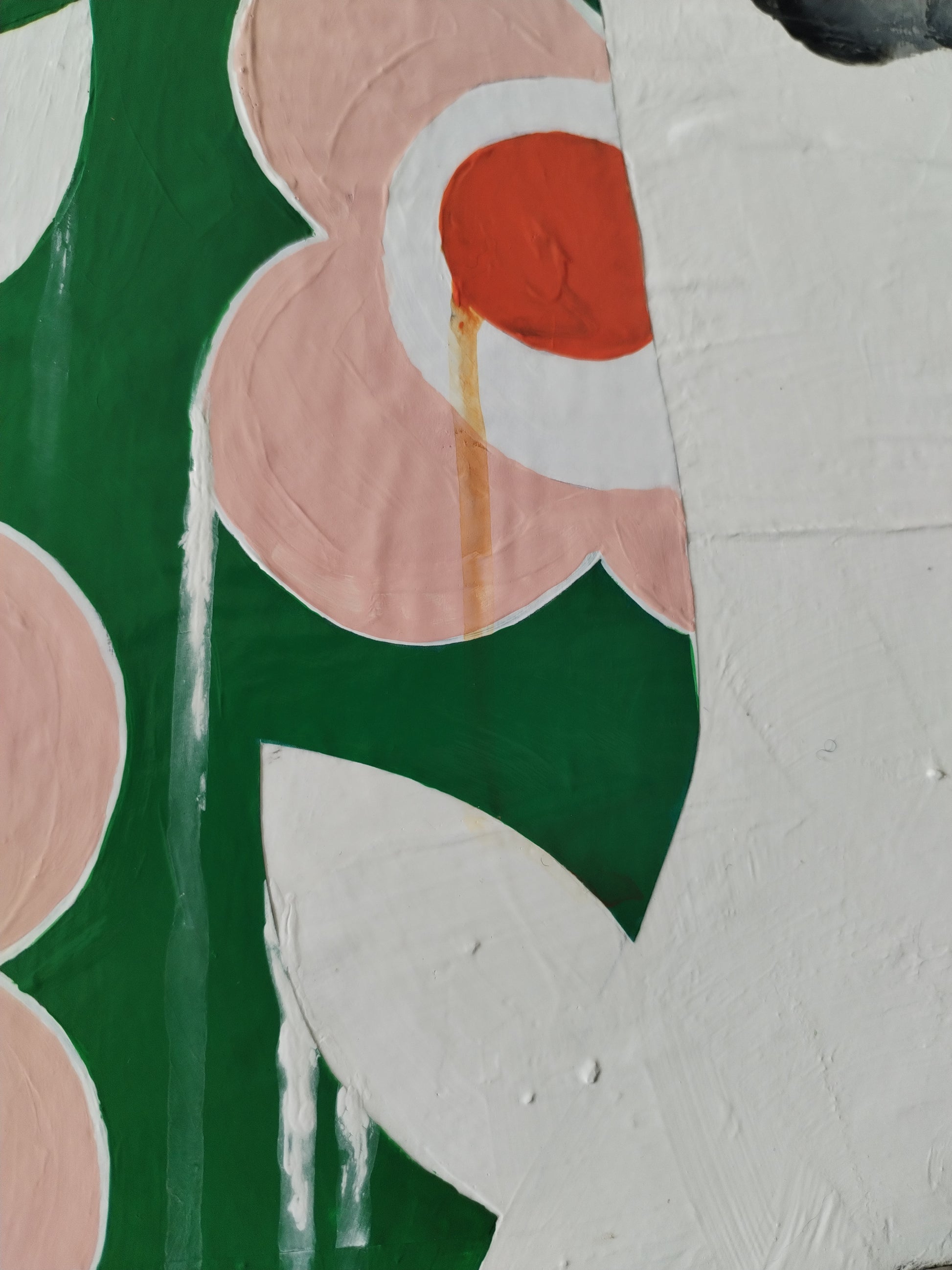 Questo lavoro raffigura una donna di schiena, in bianco e nero, avvolta da una uno sfondo floreale carico di colori accesi e vibranti.E' stato dipinto con una tecnica mista, acrilico e carta su tavola :ho realizzato un collage di base fatto di strati di carta da giornale sovrapposti, ho disegnato il soggetto, applicato una carta decorativa floreale sullo sfondo e dipinto il soggetto con acrilici. Infine ho utilizzato una vernice protettiva lucida trasparente.