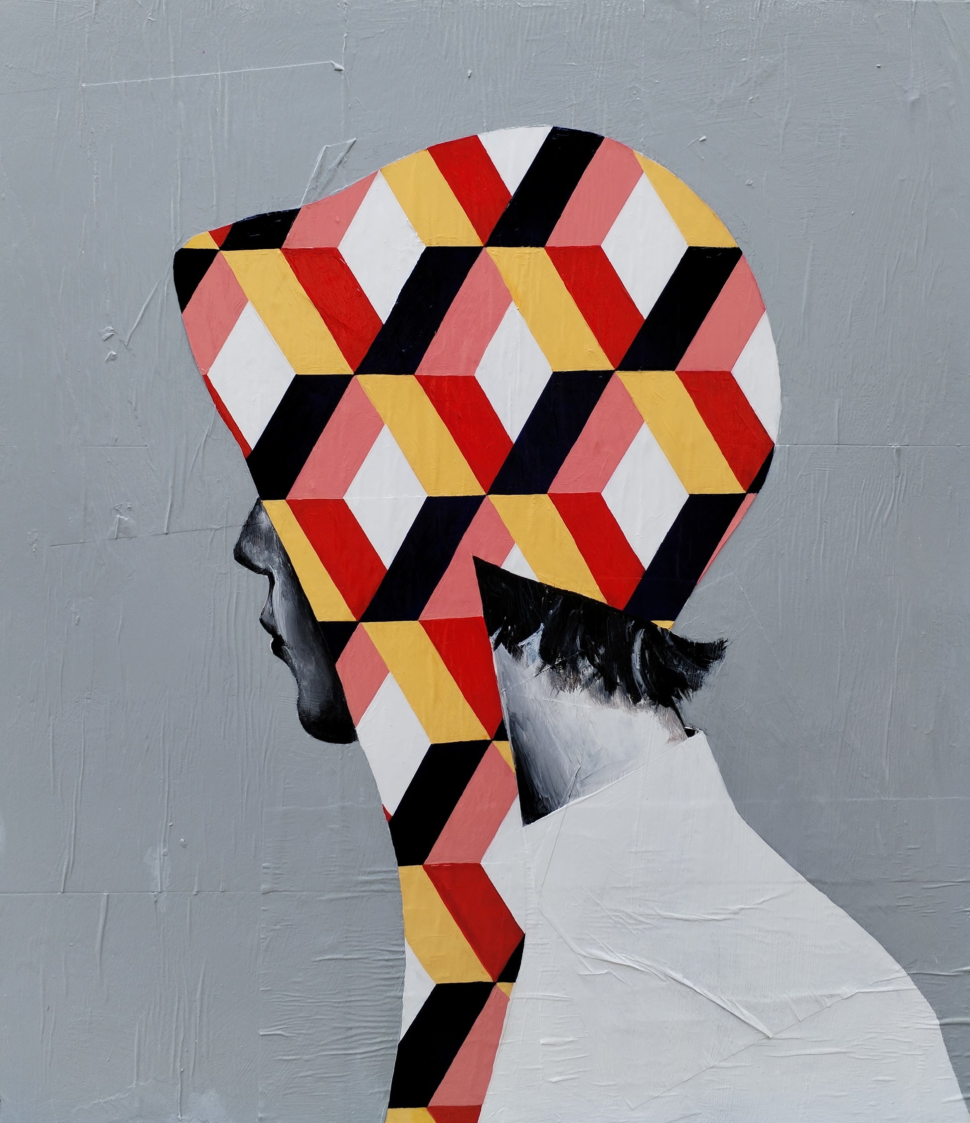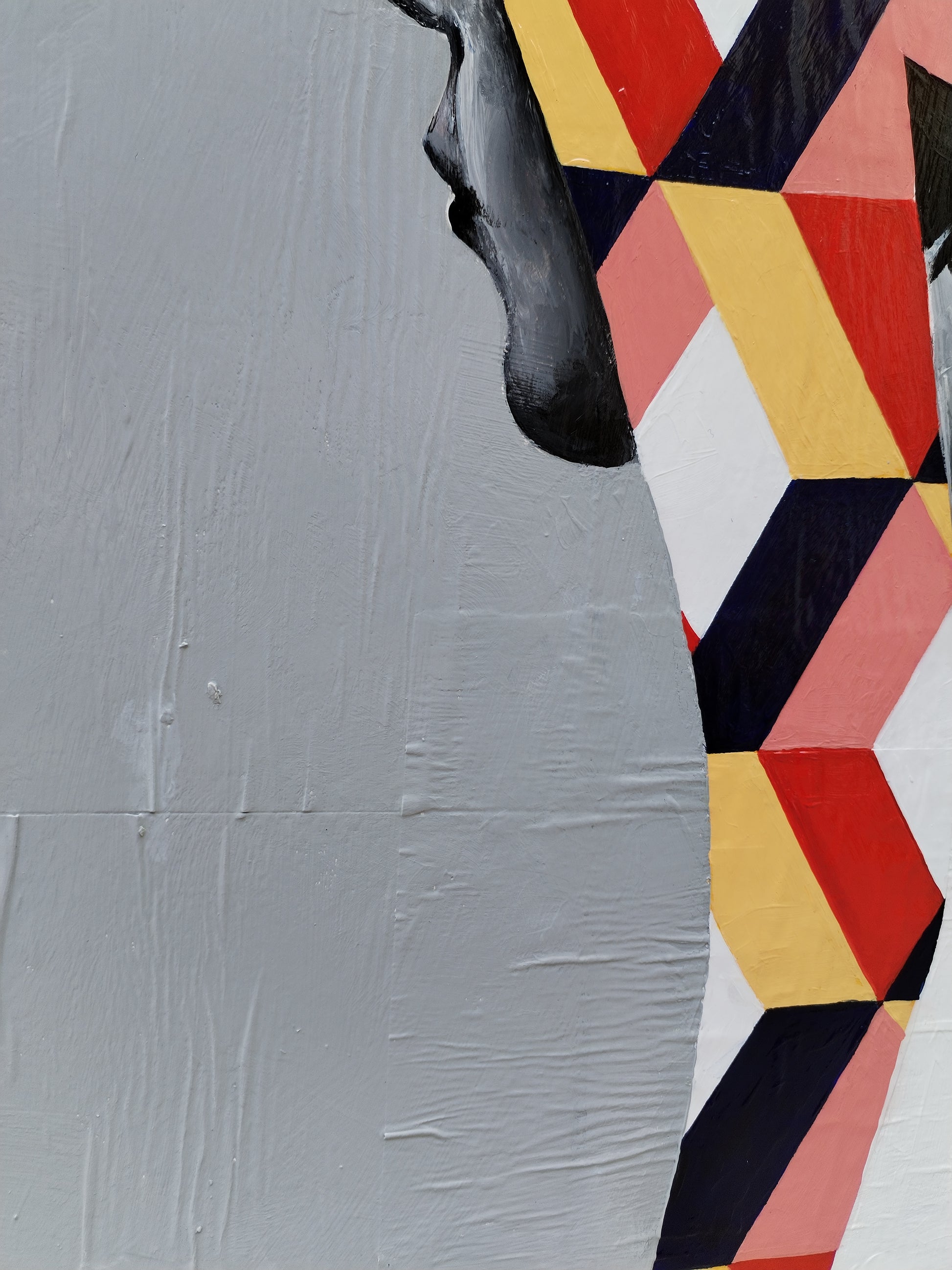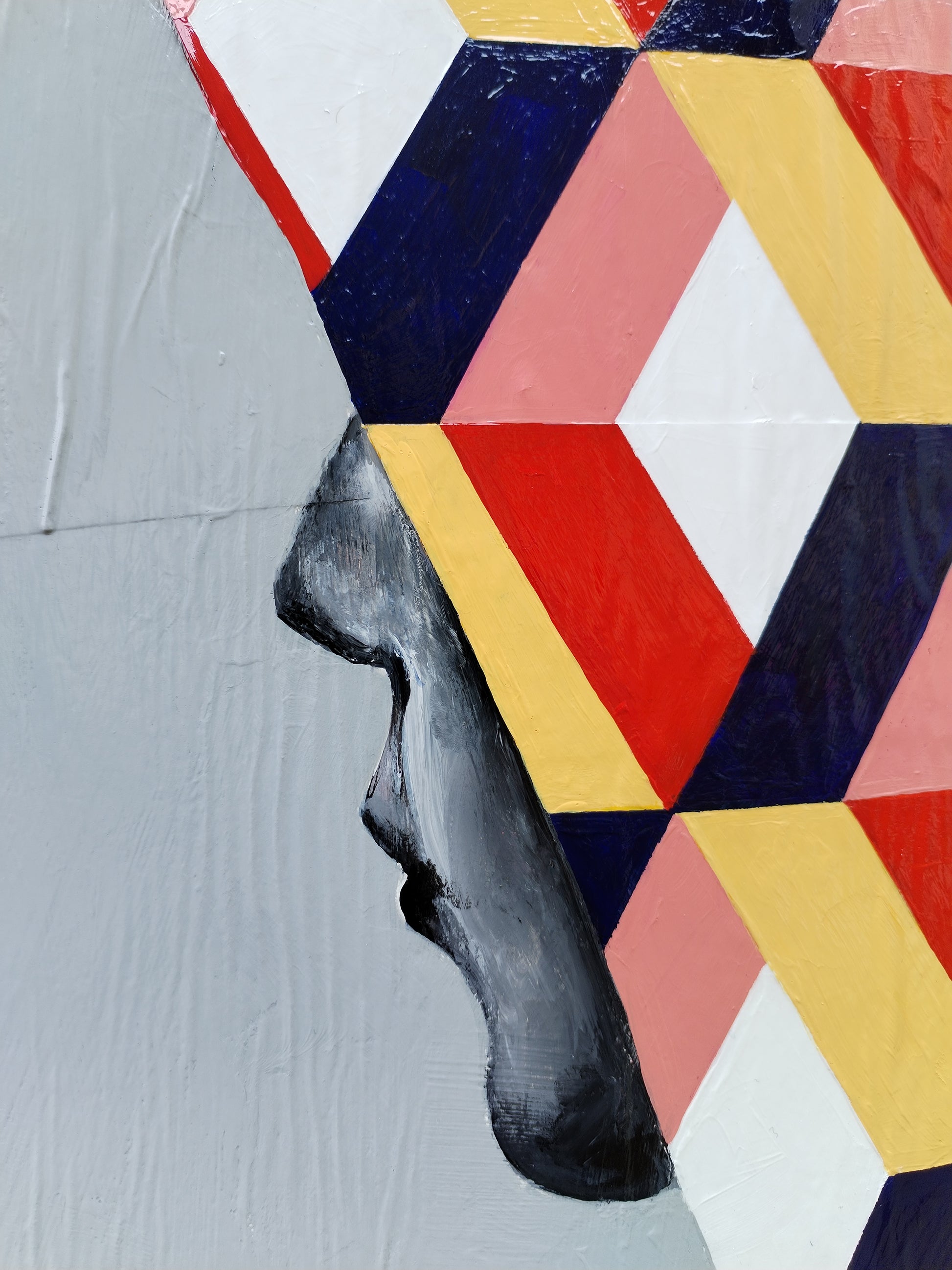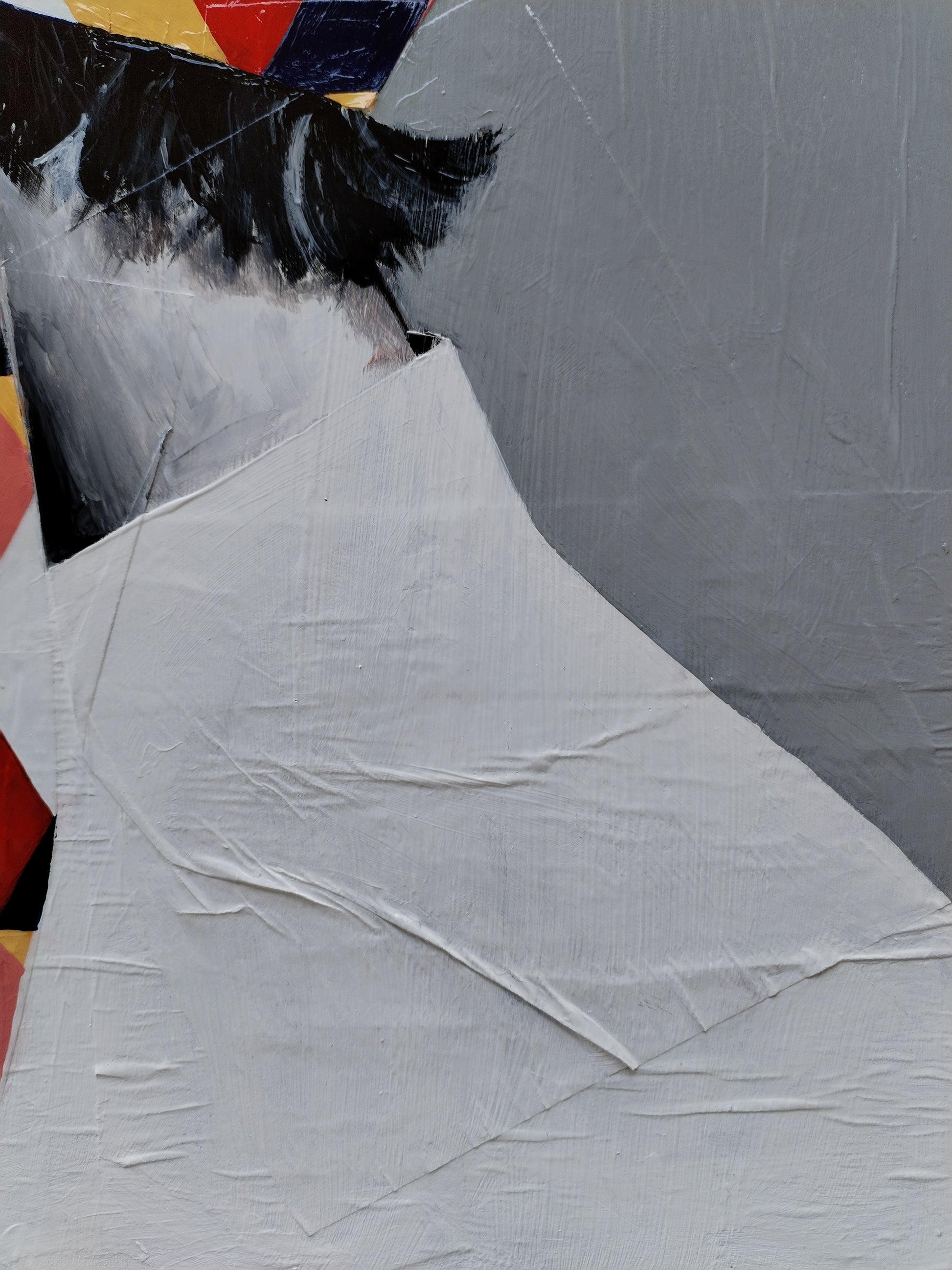 L'opera è realizzata con una tecnica mista, carta e acrilico su legno. Ho realizzato un collage di base sul supporto, creato tramite la sovrapposizione di pagine di giornale incollate con idropittura bianca. Successivamente ho applicato una carta decorativa geometrica nel cappello, che ho poi ridipinto. Il resto dell'opera è dipinto in acrilico, infine ho utilizzato una vernice trasparente lucida protettiva.
