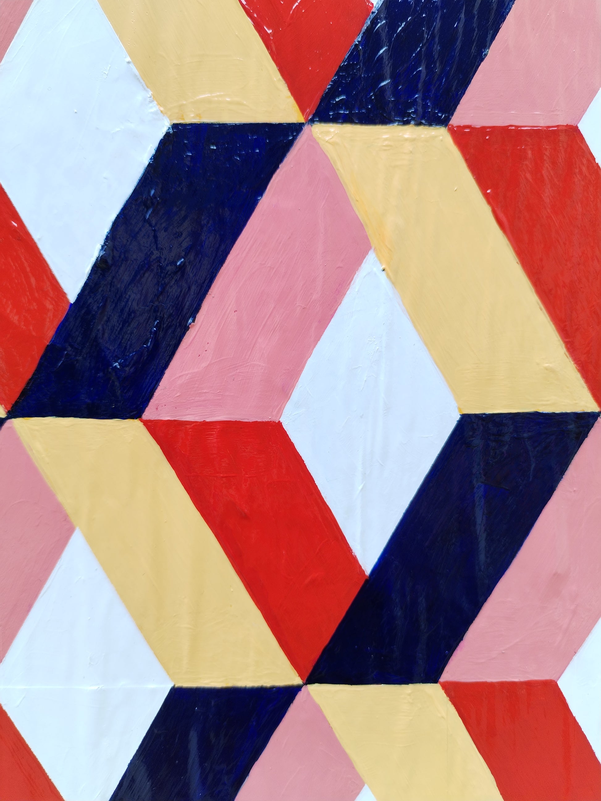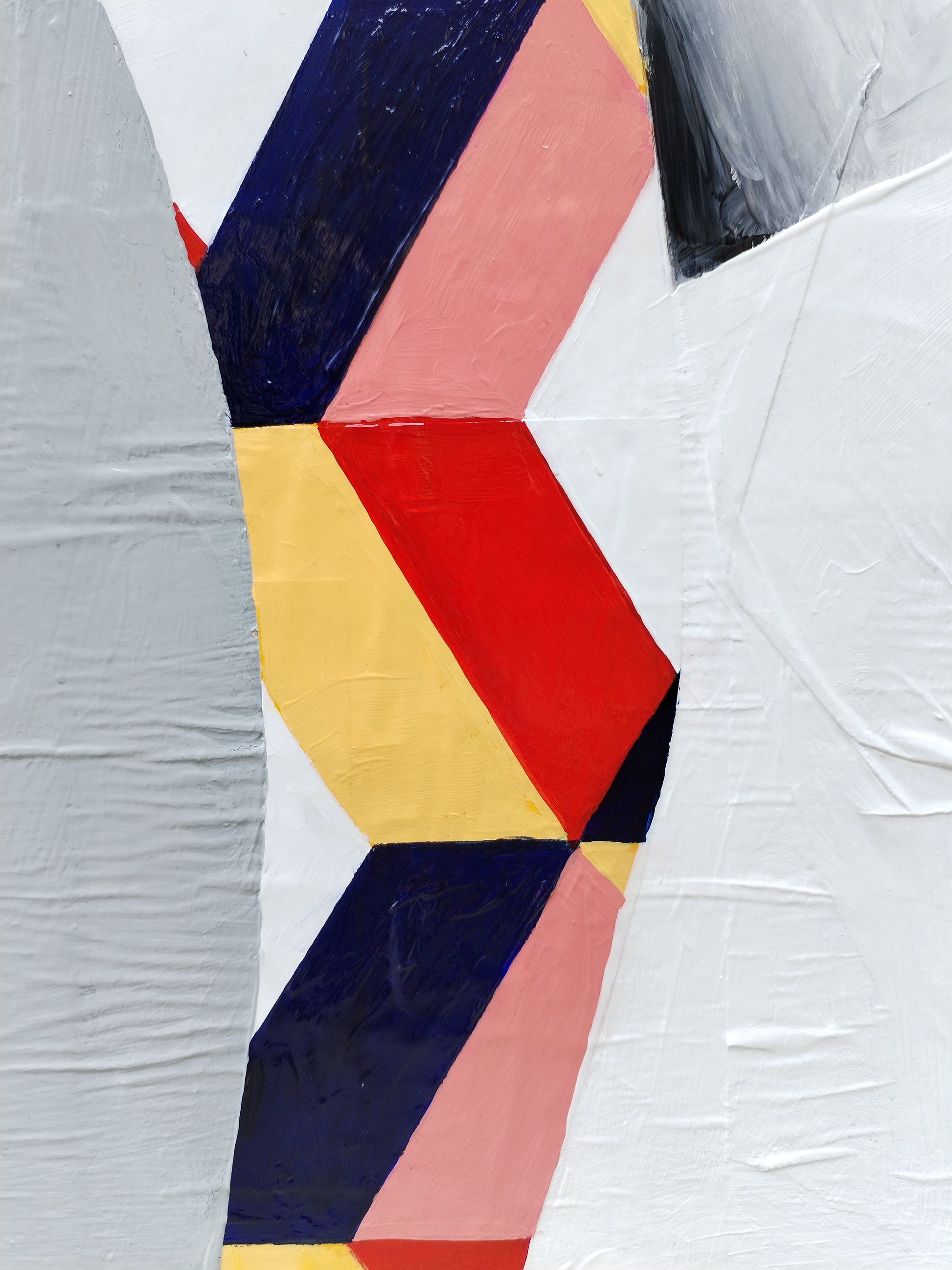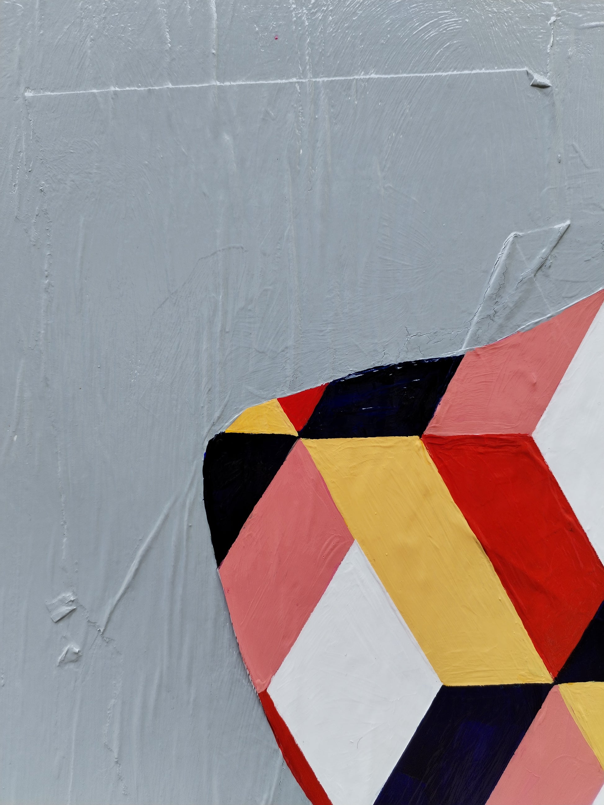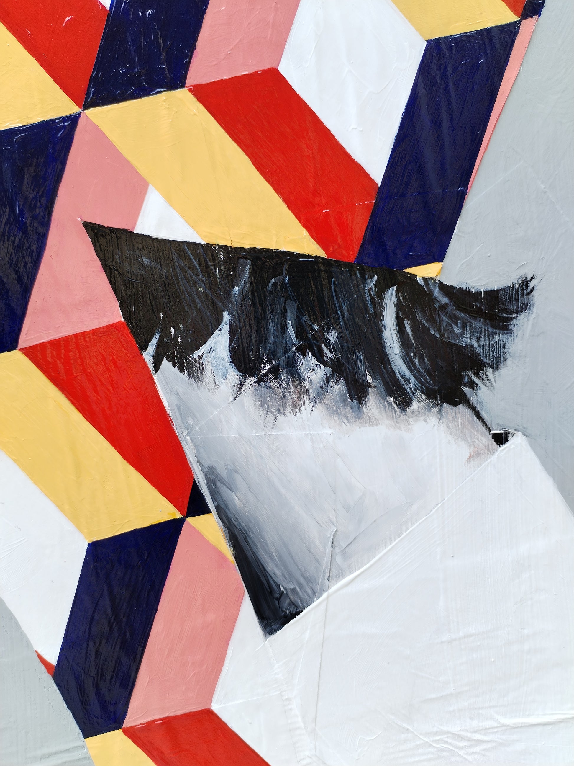L'opera è realizzata con una tecnica mista, carta e acrilico su legno. Ho realizzato un collage di base sul supporto, creato tramite la sovrapposizione di pagine di giornale incollate con idropittura bianca. Successivamente ho applicato una carta decorativa geometrica nel cappello, che ho poi ridipinto. Il resto dell'opera è dipinto in acrilico, infine ho utilizzato una vernice trasparente lucida protettiva.
