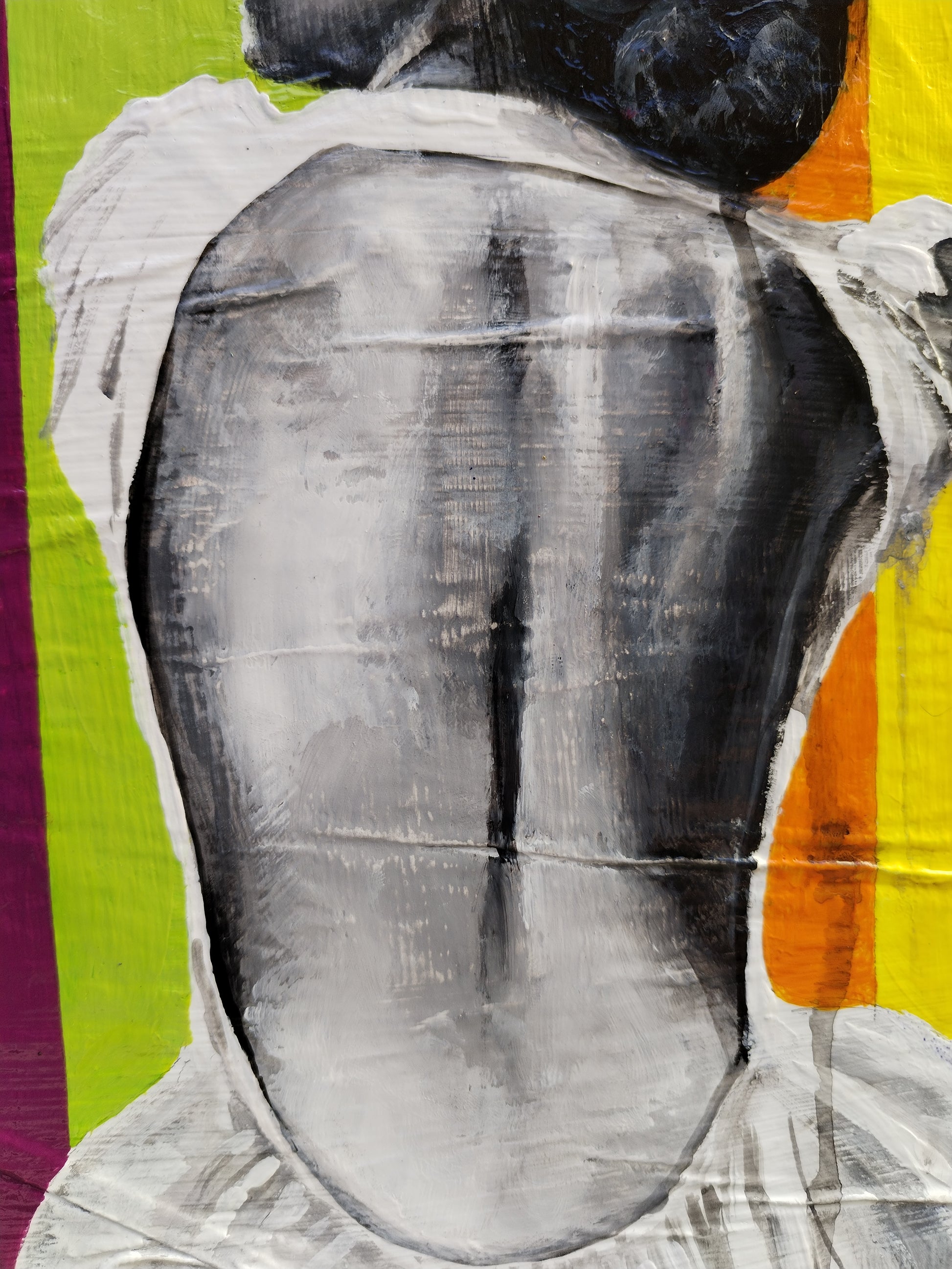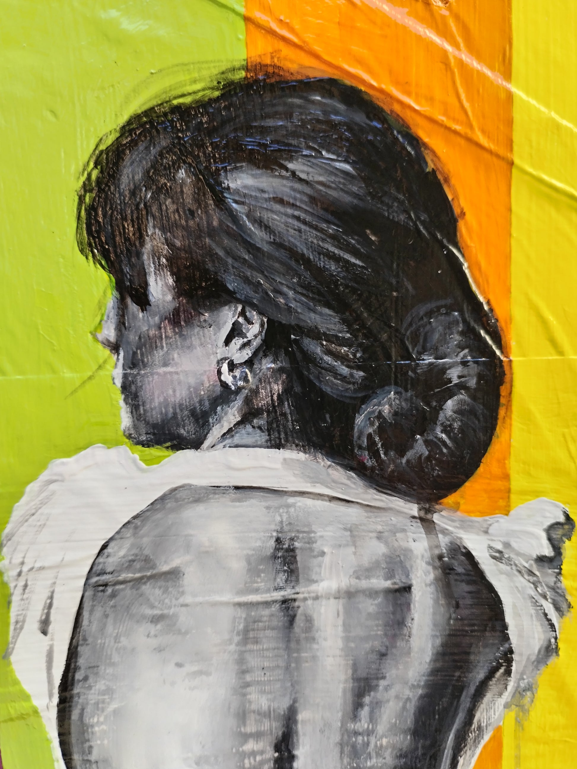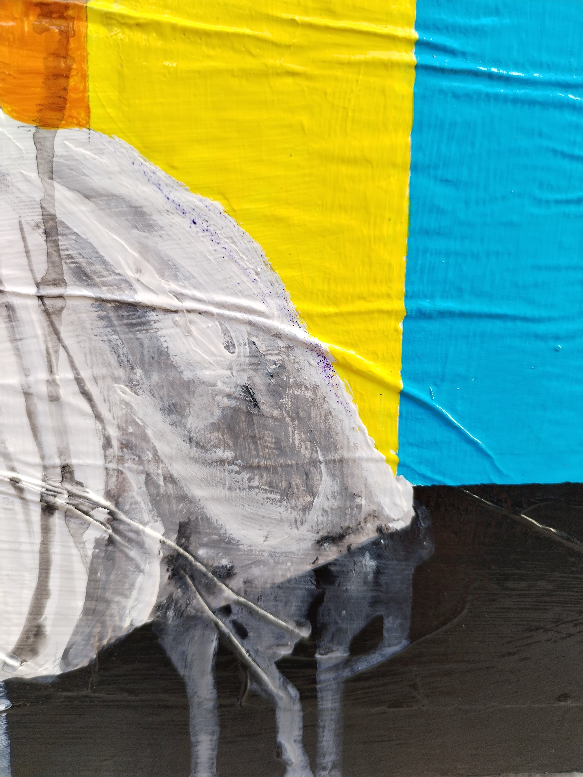 L'opera è realizzata con una tecnica mista, carta e acrilico su legno. Ho realizzato un collage di base sul supporto, creato tramite la sovrapposizione di pagine di giornale incollate con idropittura bianca. Successivamente ho dipinto il soggetto con acrilici. Infine ho utilizzato una vernice trasparente lucida protettiva.