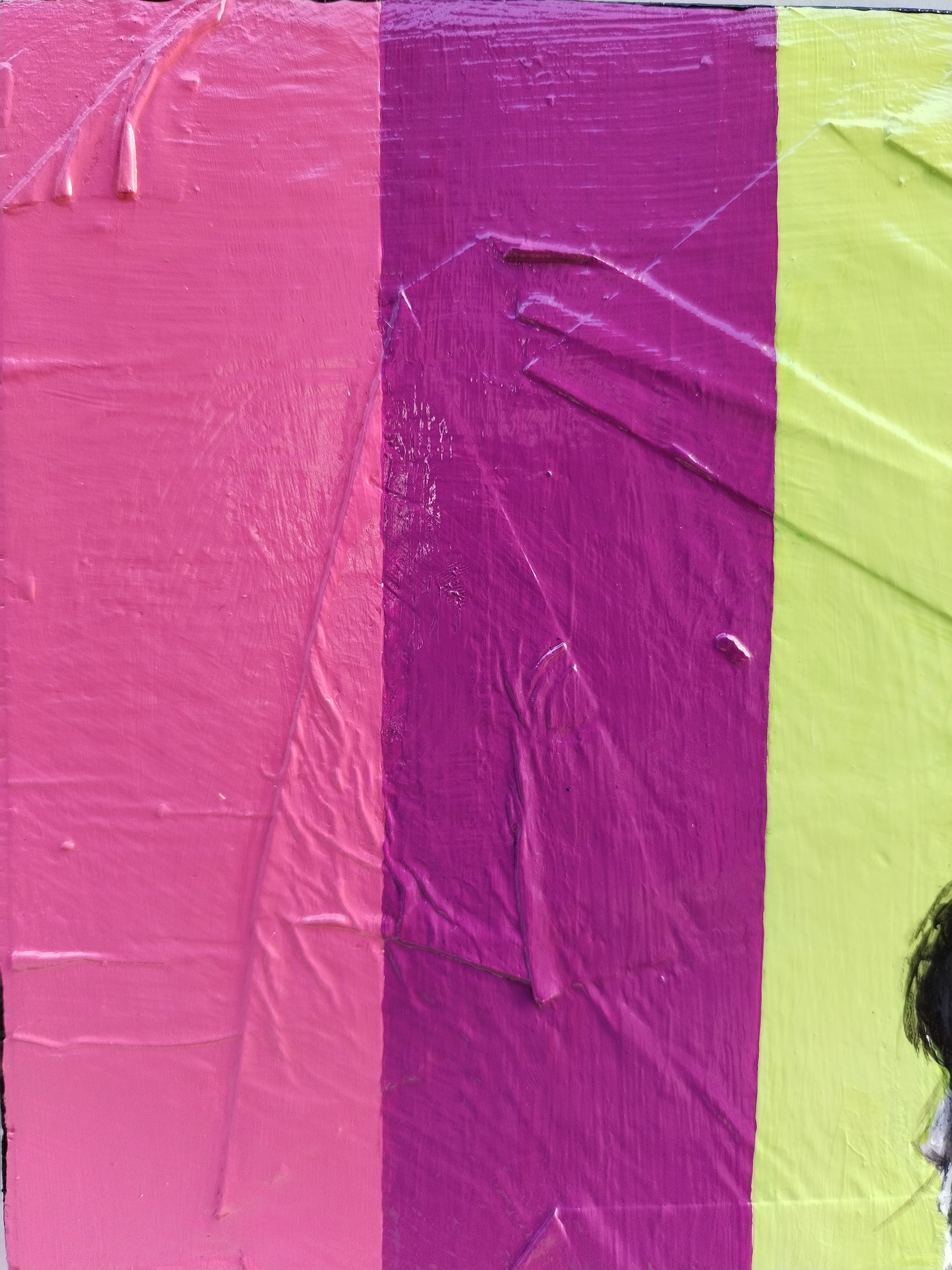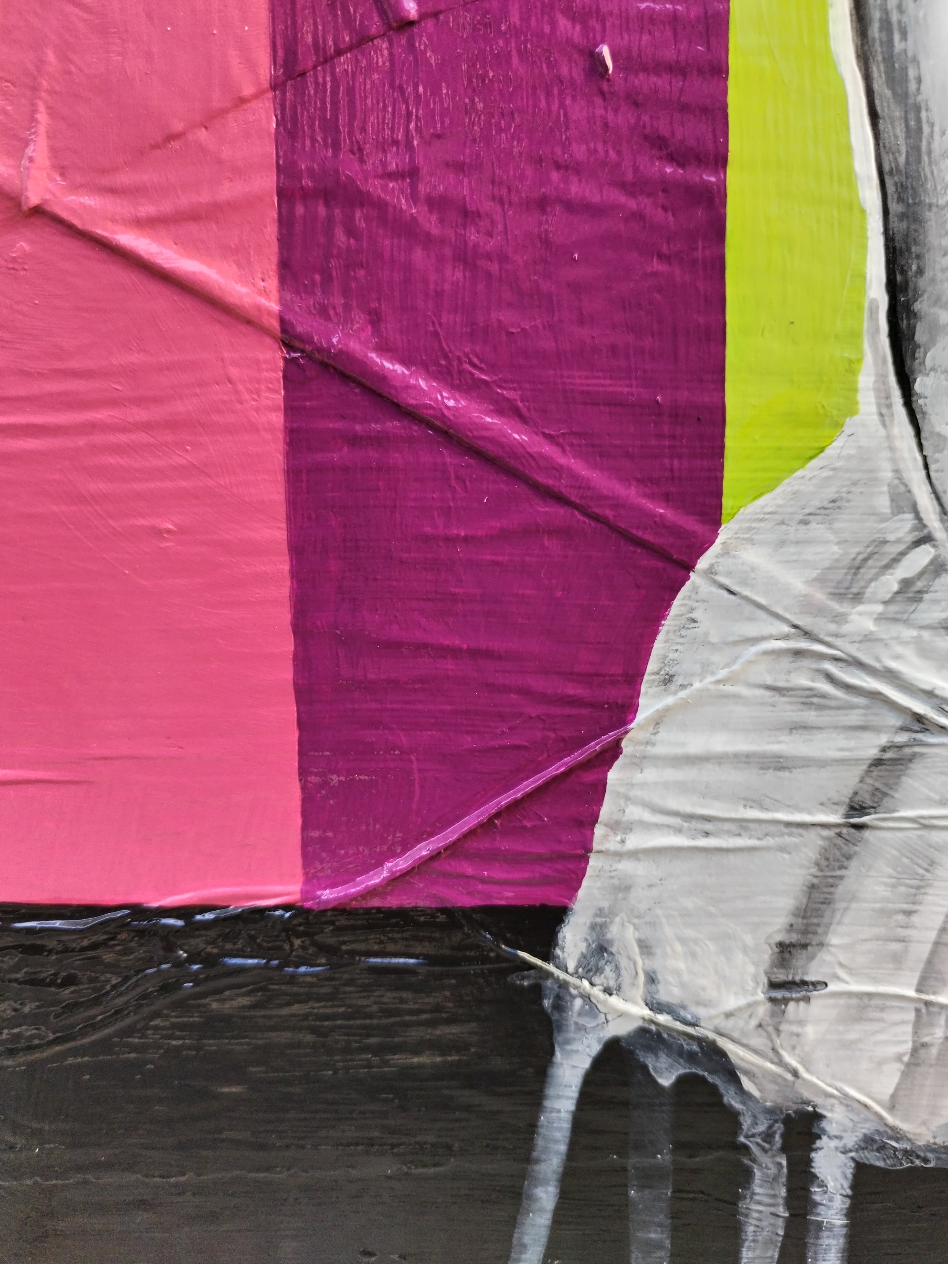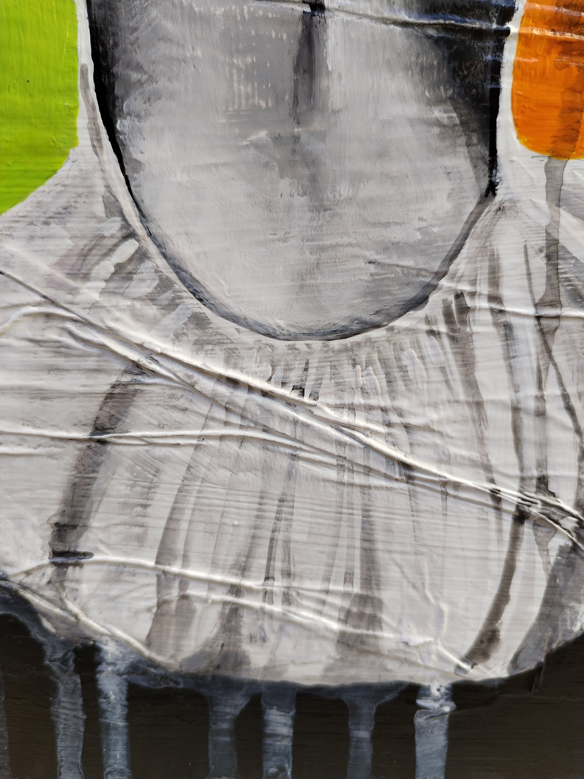 L'opera è realizzata con una tecnica mista, carta e acrilico su legno. Ho realizzato un collage di base sul supporto, creato tramite la sovrapposizione di pagine di giornale incollate con idropittura bianca. Successivamente ho dipinto il soggetto con acrilici. Infine ho utilizzato una vernice trasparente lucida protettiva.