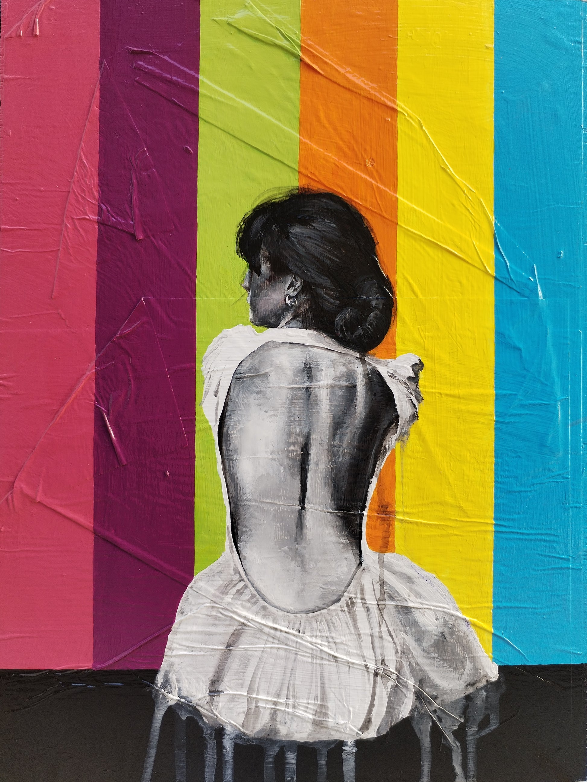 Il soggetto del dipinto è una giovane donna seduta di spalle dipinta in bianco e nero, in contrasto con uno sfondo carico di colori. "VIVERE A COLORI" vuole essere un inno alla vita, un invito a lanciarsi, lasciarsi andare alla bellezza di vita una vita piena di colori.