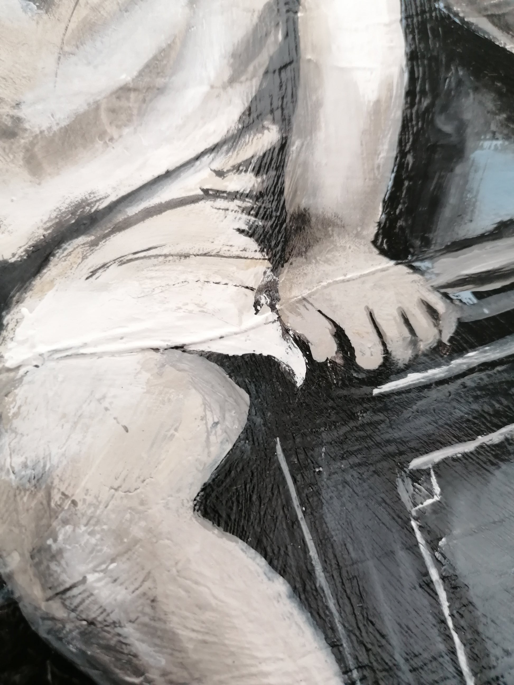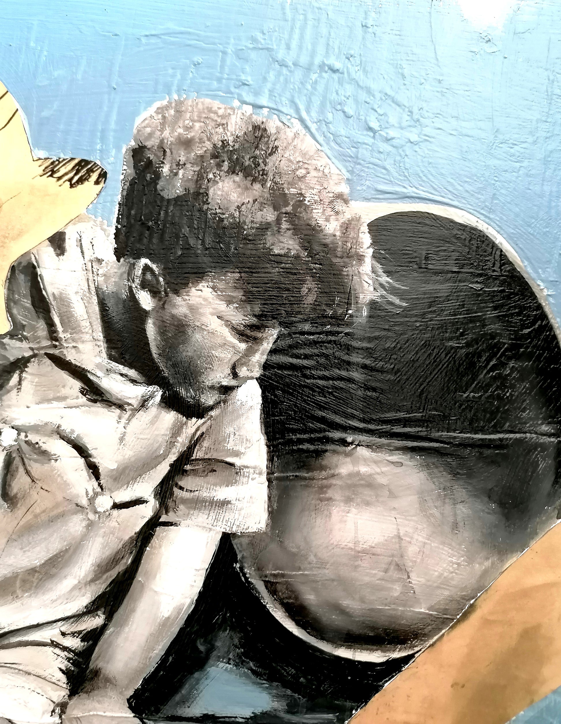 Ecco il motivo per il quale le due donne che ho dipinto sono senza volto, mentre il bambino,in bianco e nero, sovrasta su di esse,quasi annullando la loro presenza.