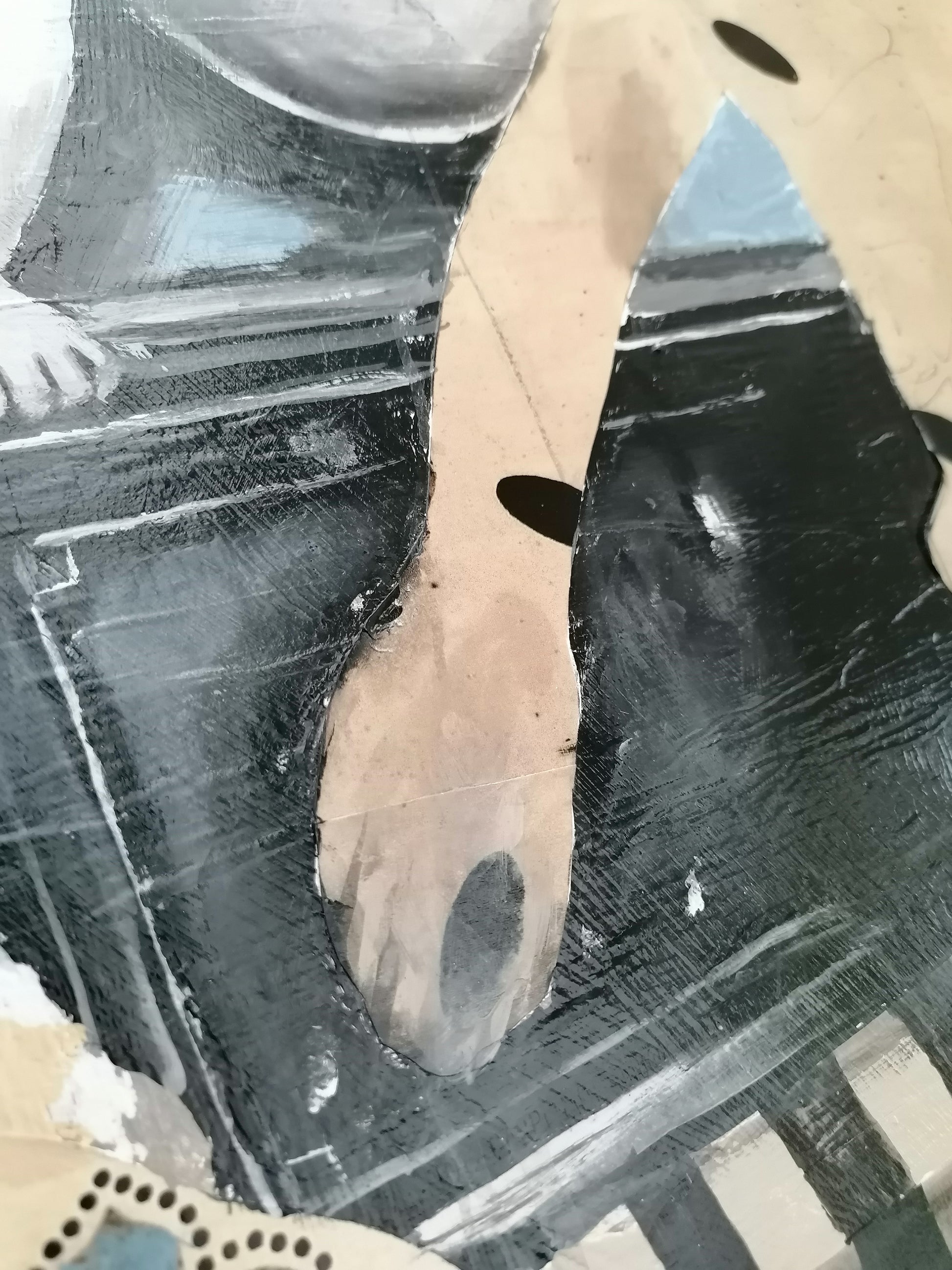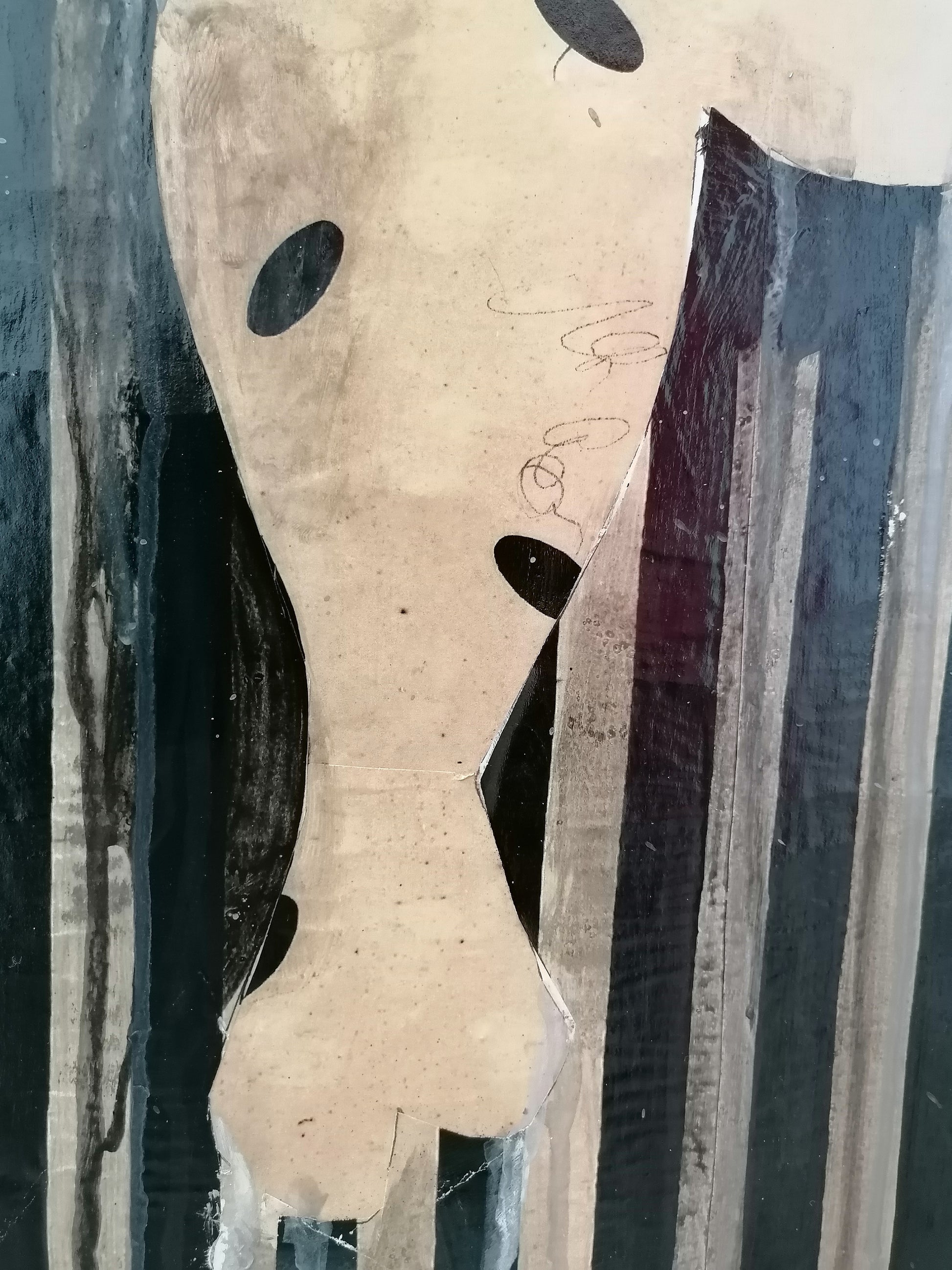 Le donne e la parte sottostante a righe sono state realizzate tramite l'applicazione di carte vintage mentre tutto il resto è dipinto in acrilico.