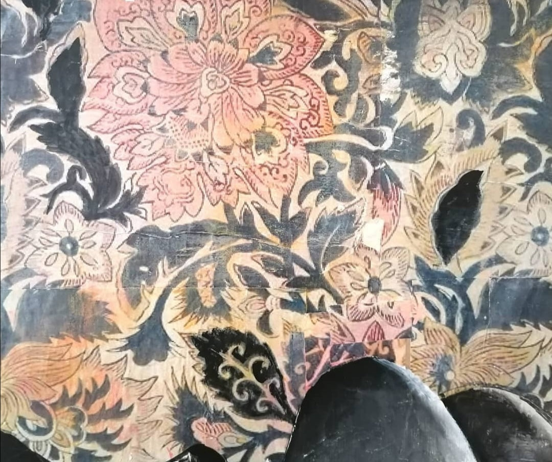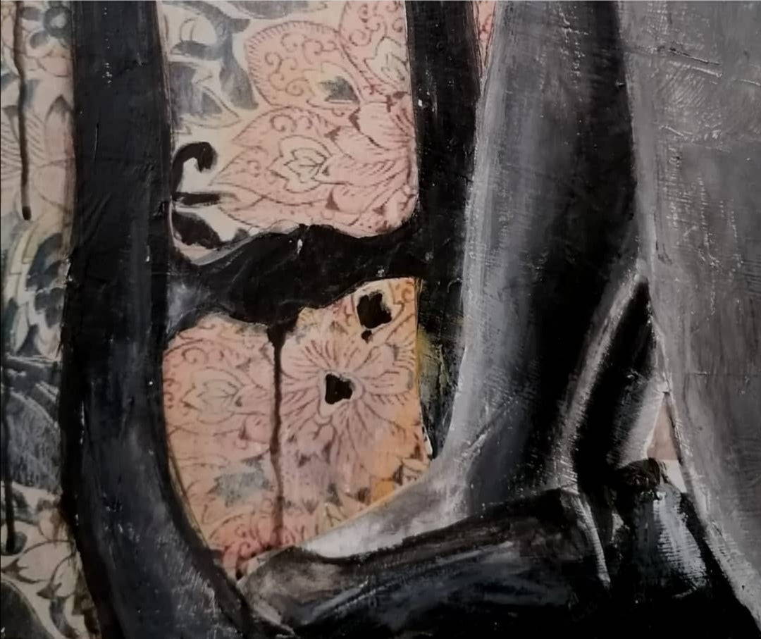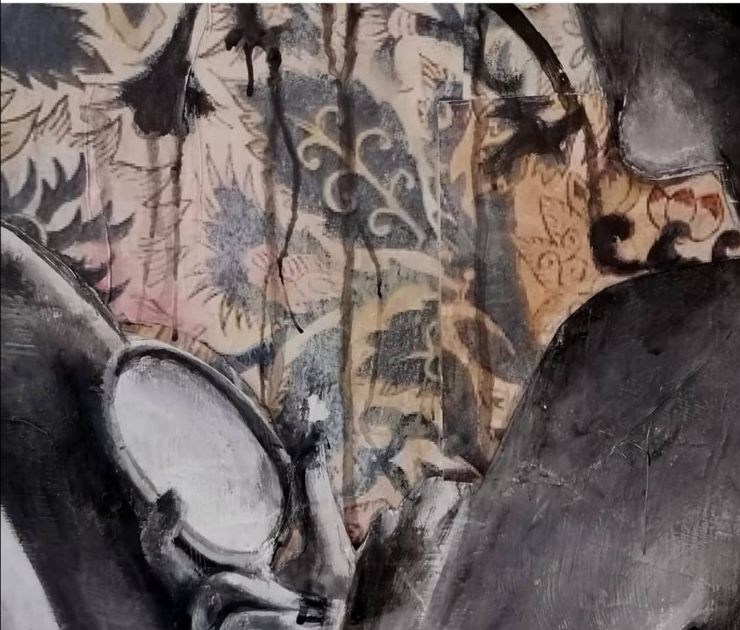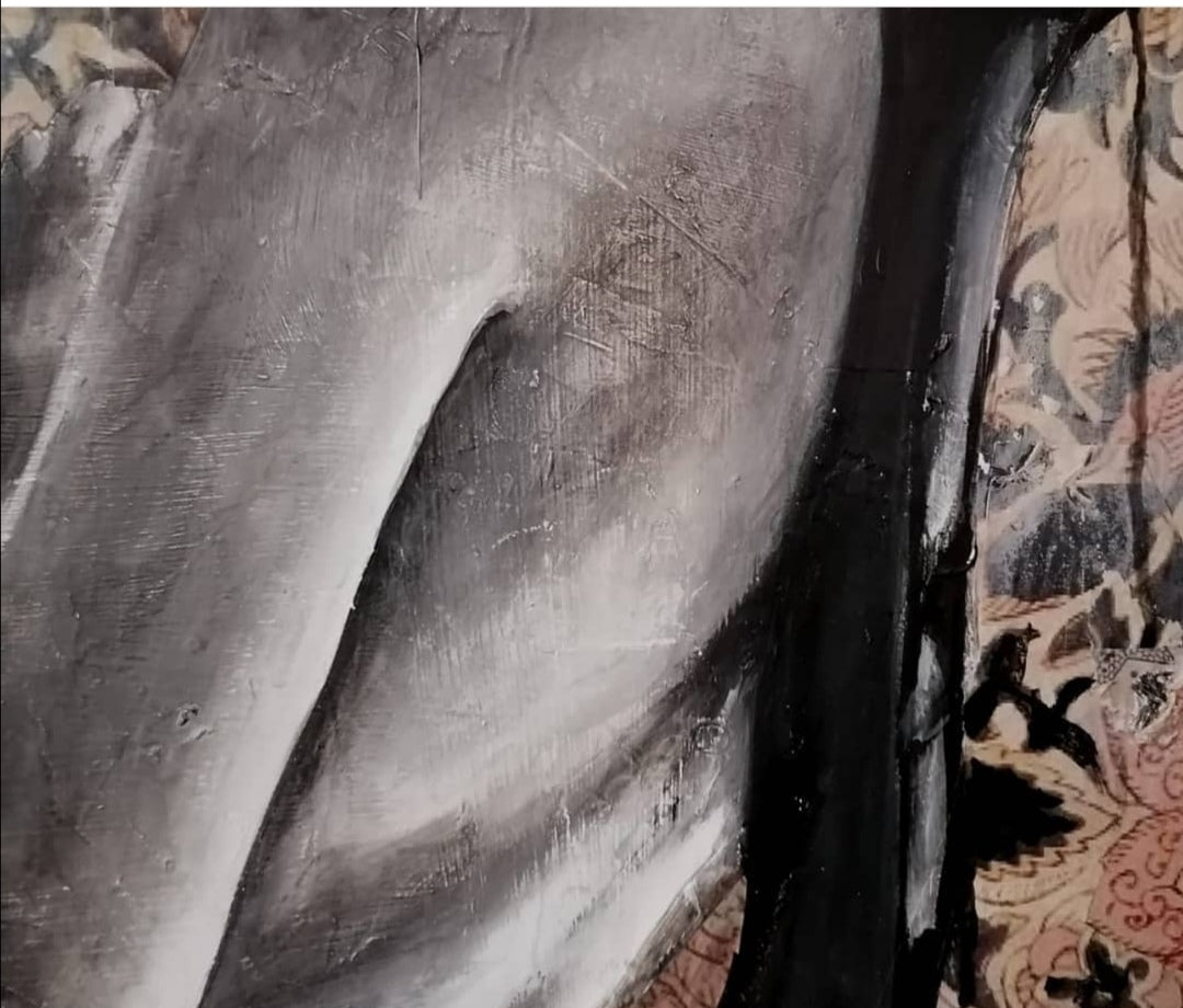 Una donna, seminuda, ritratta in un momento intimo e privato, in uno sfondo floreale, esotico e caldo.