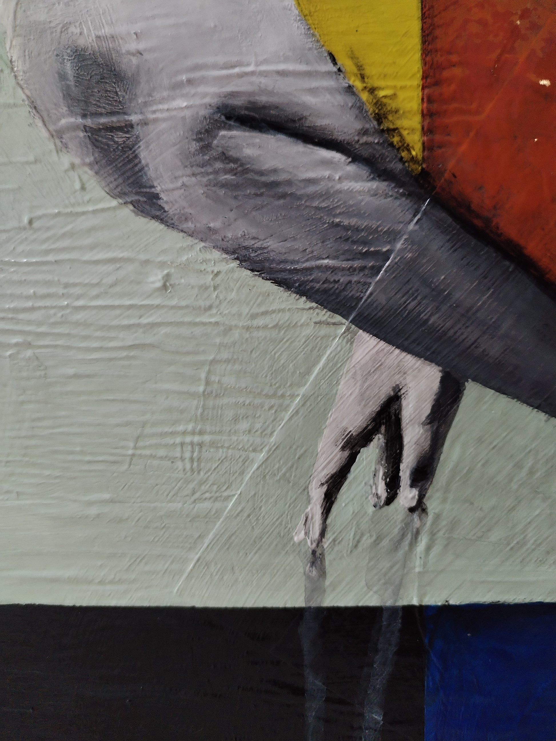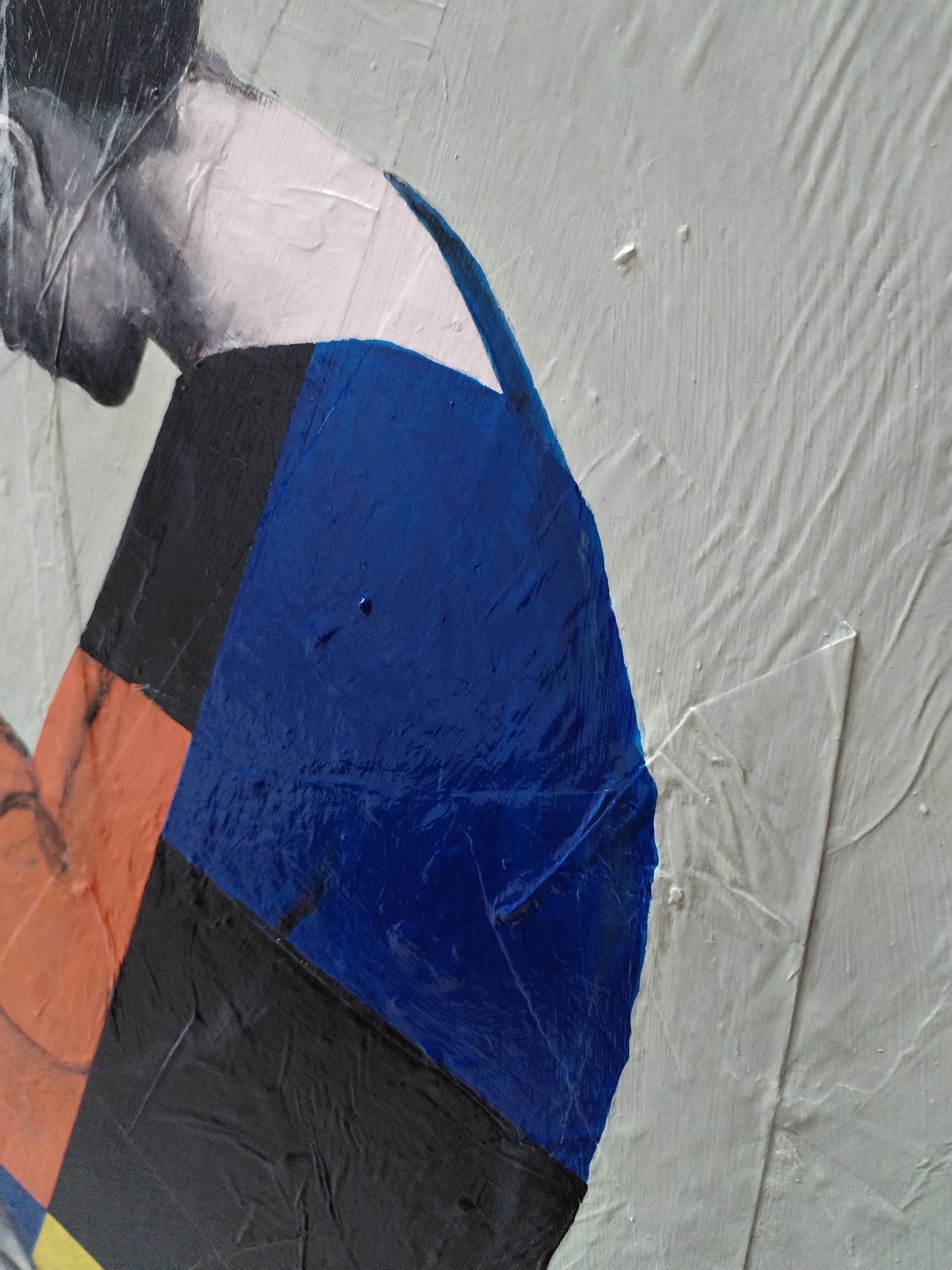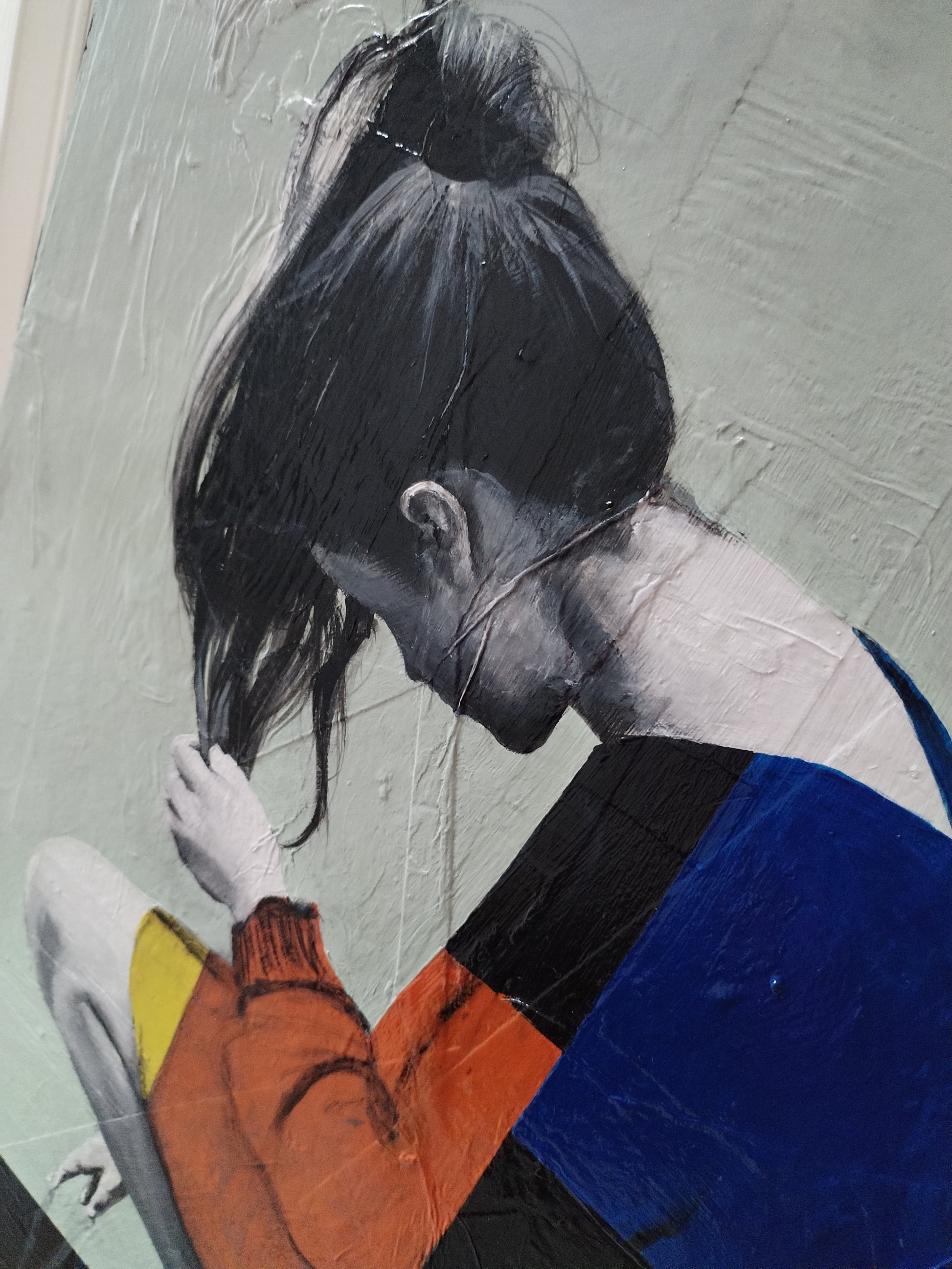 L'opera è realizzata con una tecnica mista, carta e acrilico su tavola.Ho realizzato un collage di base sul supporto, creato tramite la sovrapposizione di pagine di giornale incollate con idropittura bianca.