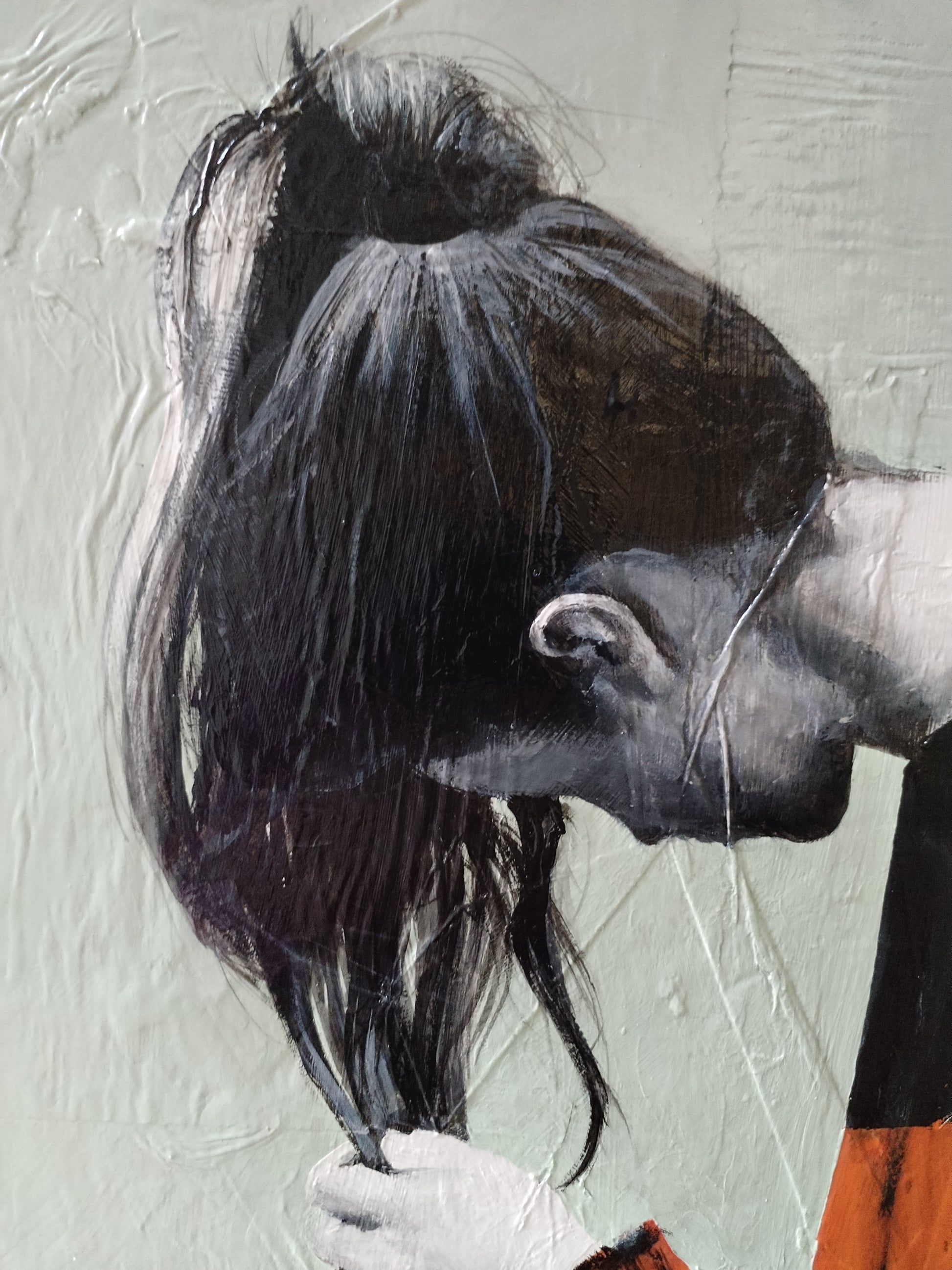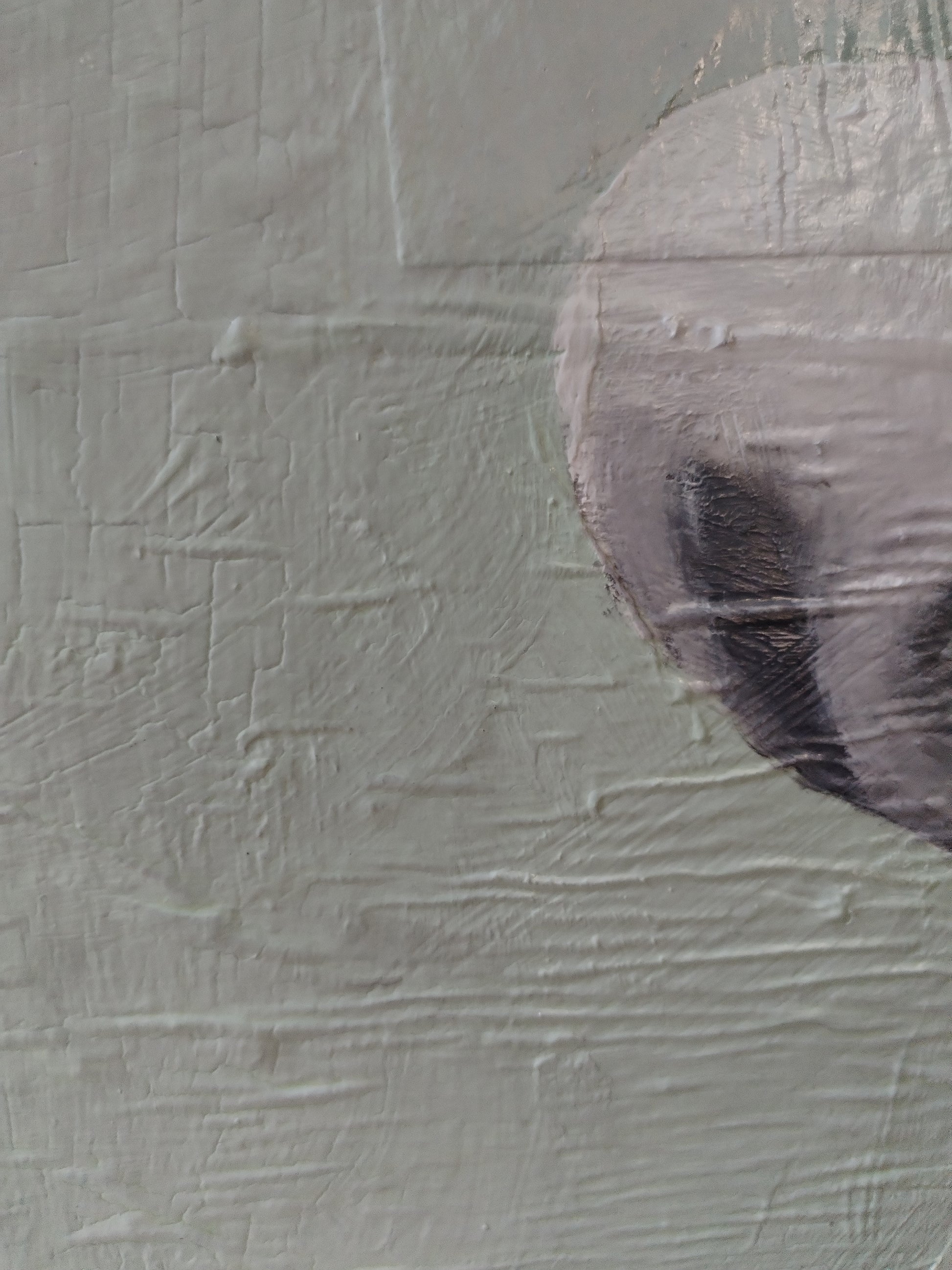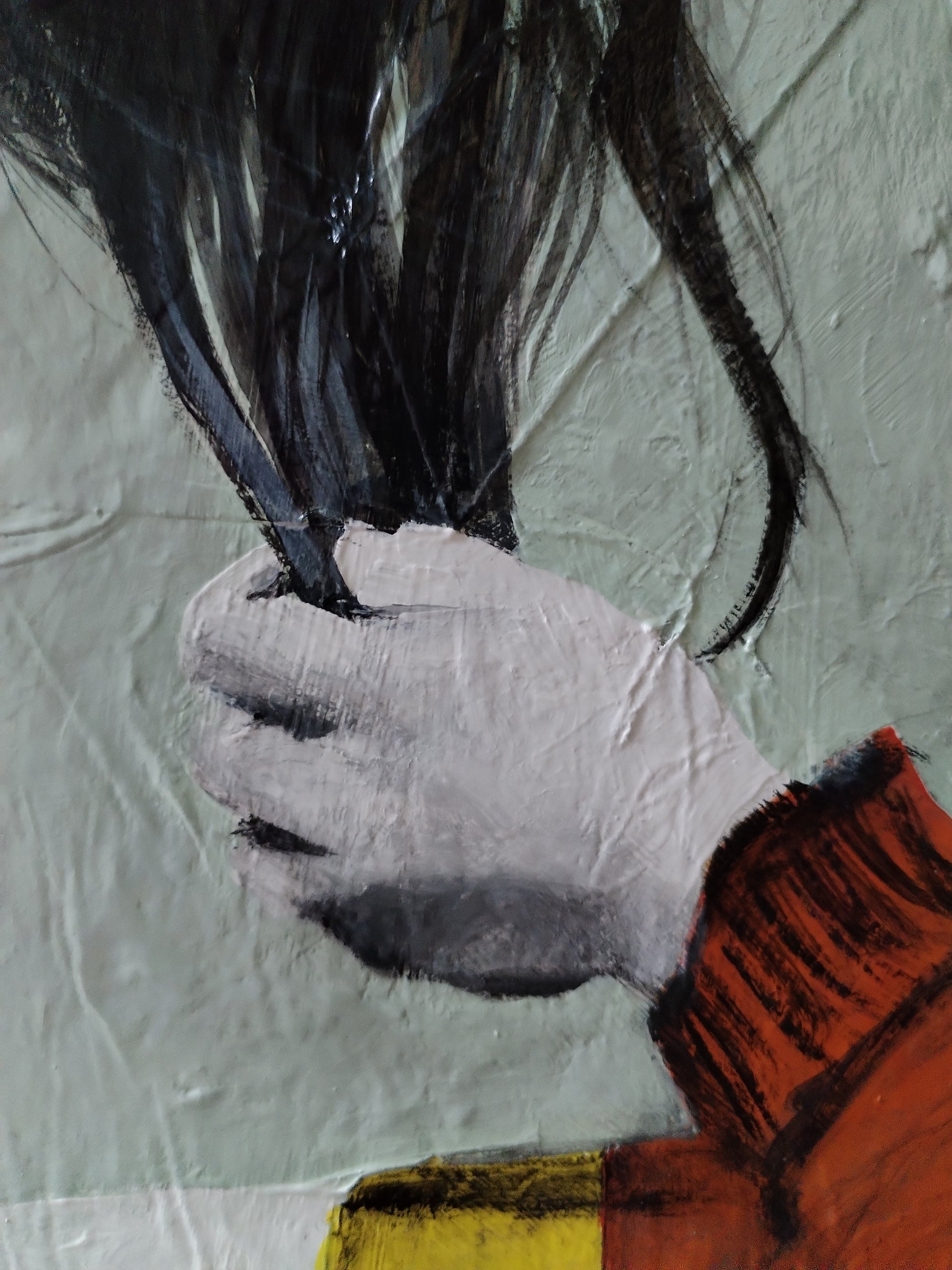 L'opera è realizzata con una tecnica mista, carta e acrilico su tavola.Ho realizzato un collage di base sul supporto, creato tramite la sovrapposizione di pagine di giornale incollate con idropittura bianca.
