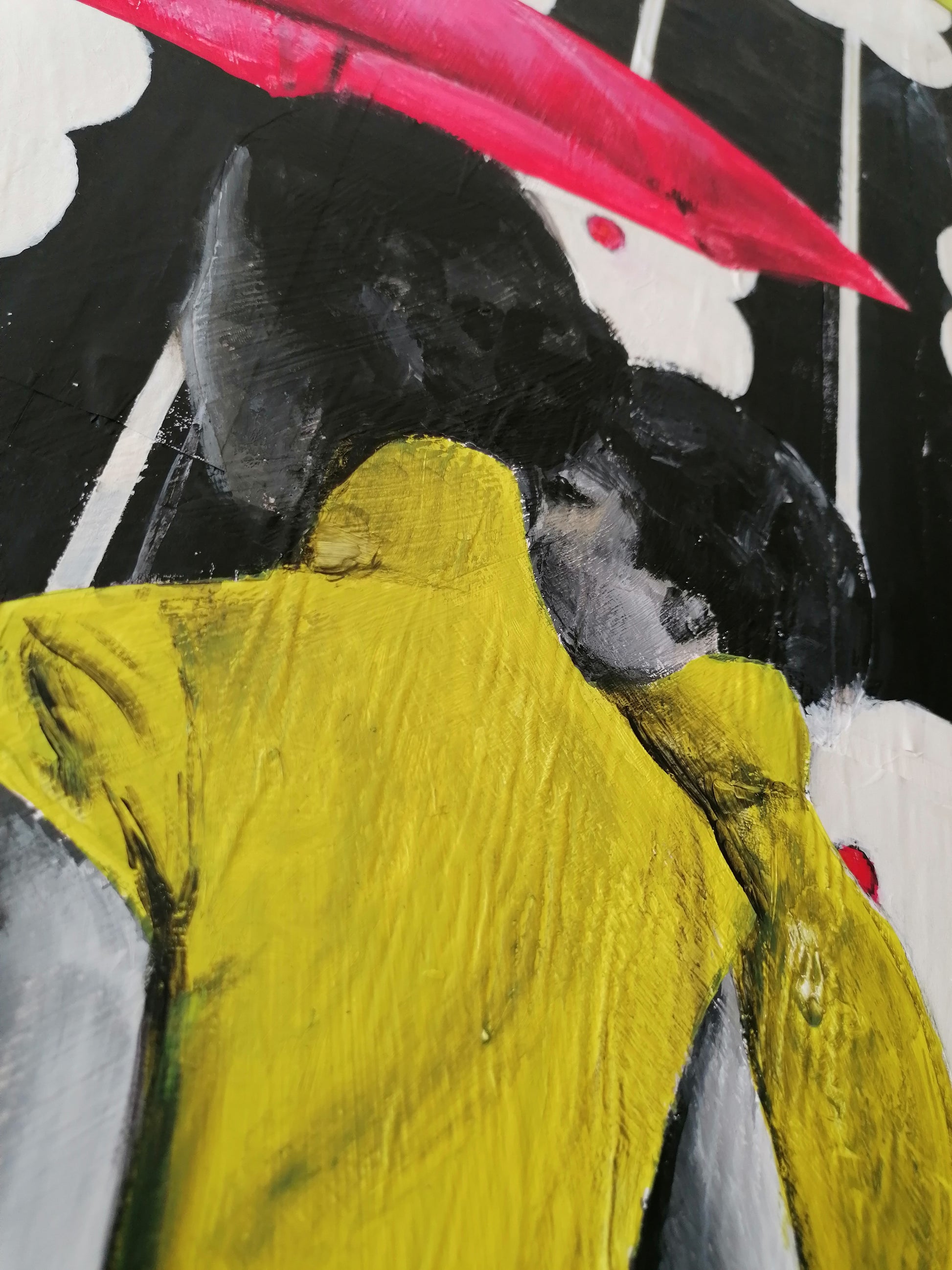 Il mio ultimo dipinto, l' OMBRELLO ROSSO, nasce dopo un periodo critico e l'ombrello, appunto, è rappresentato in chiave metaforica : una situazione da risolvere o una paura da affrontare, un paio di braccia accoglienti in cui ripararsi per non essere bagnati dalla pioggia della vita.