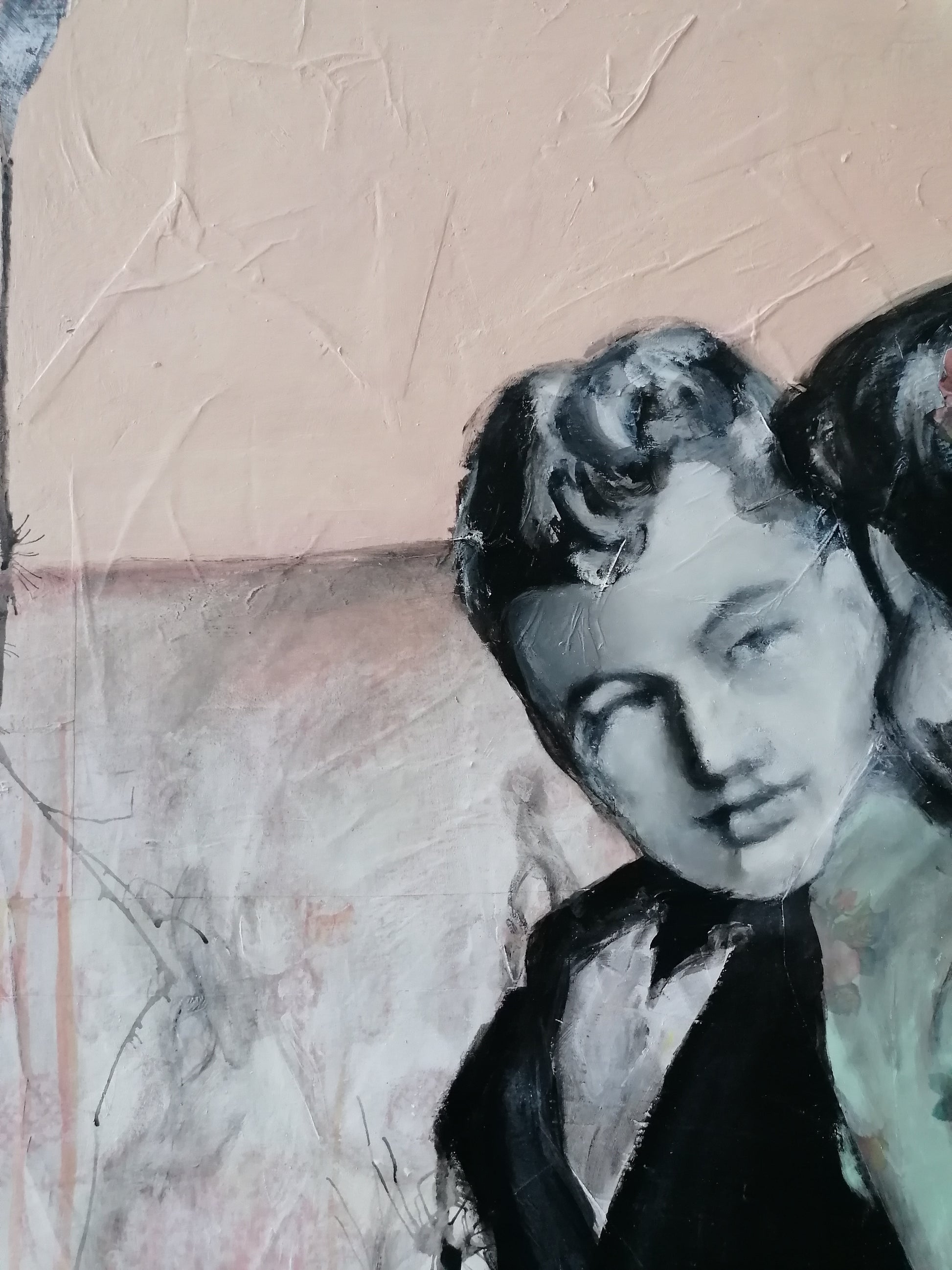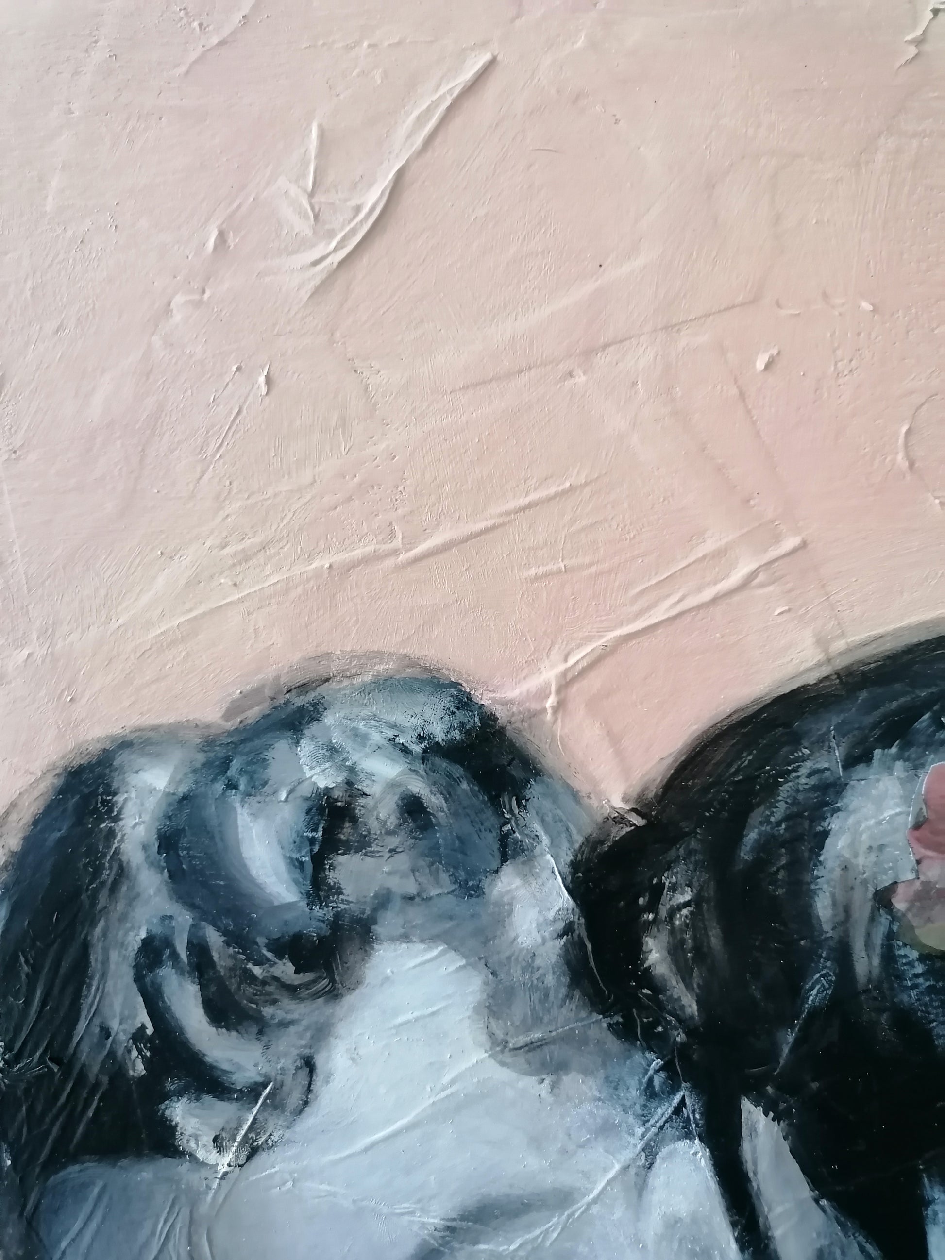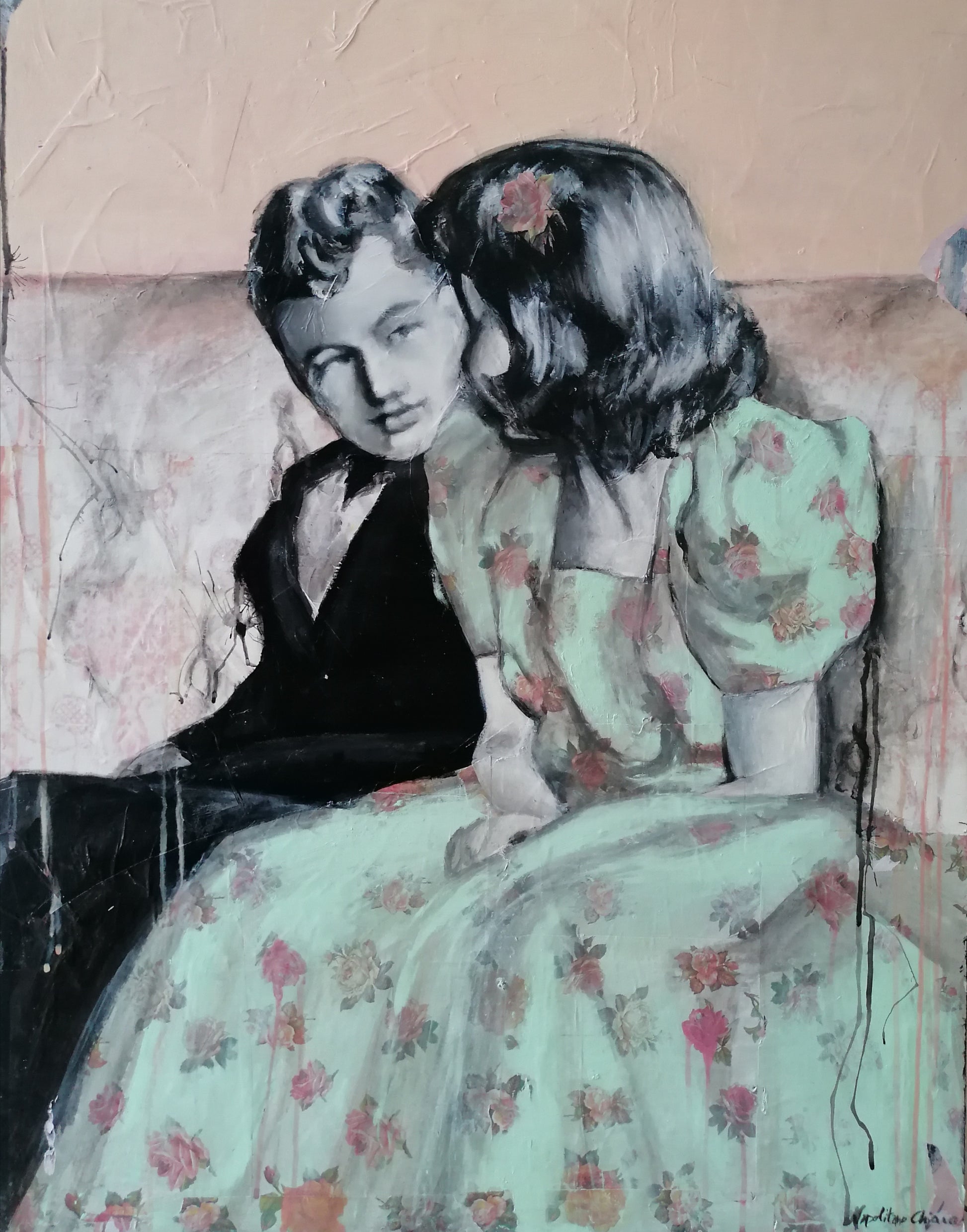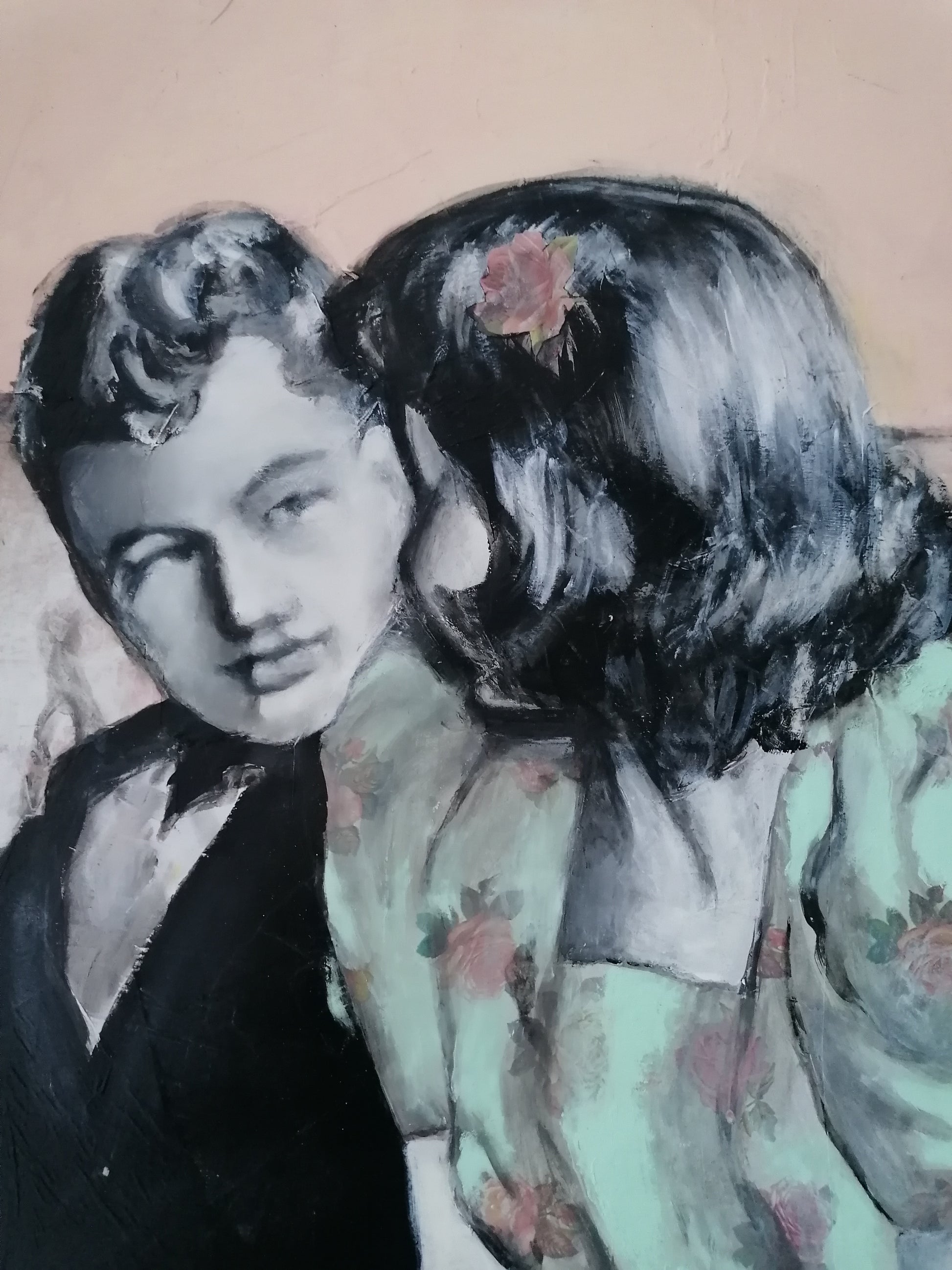 Una scena catturata in un momento privato. Due ragazzini alle prese con la loro prima cotta. Lo sguardo di lui è vivace e quasi malizioso, il volto di lei è coperto ma possiamo immaginarne l'espressione imbarazzata e timida dalle braccia giunte sulla gonna.
