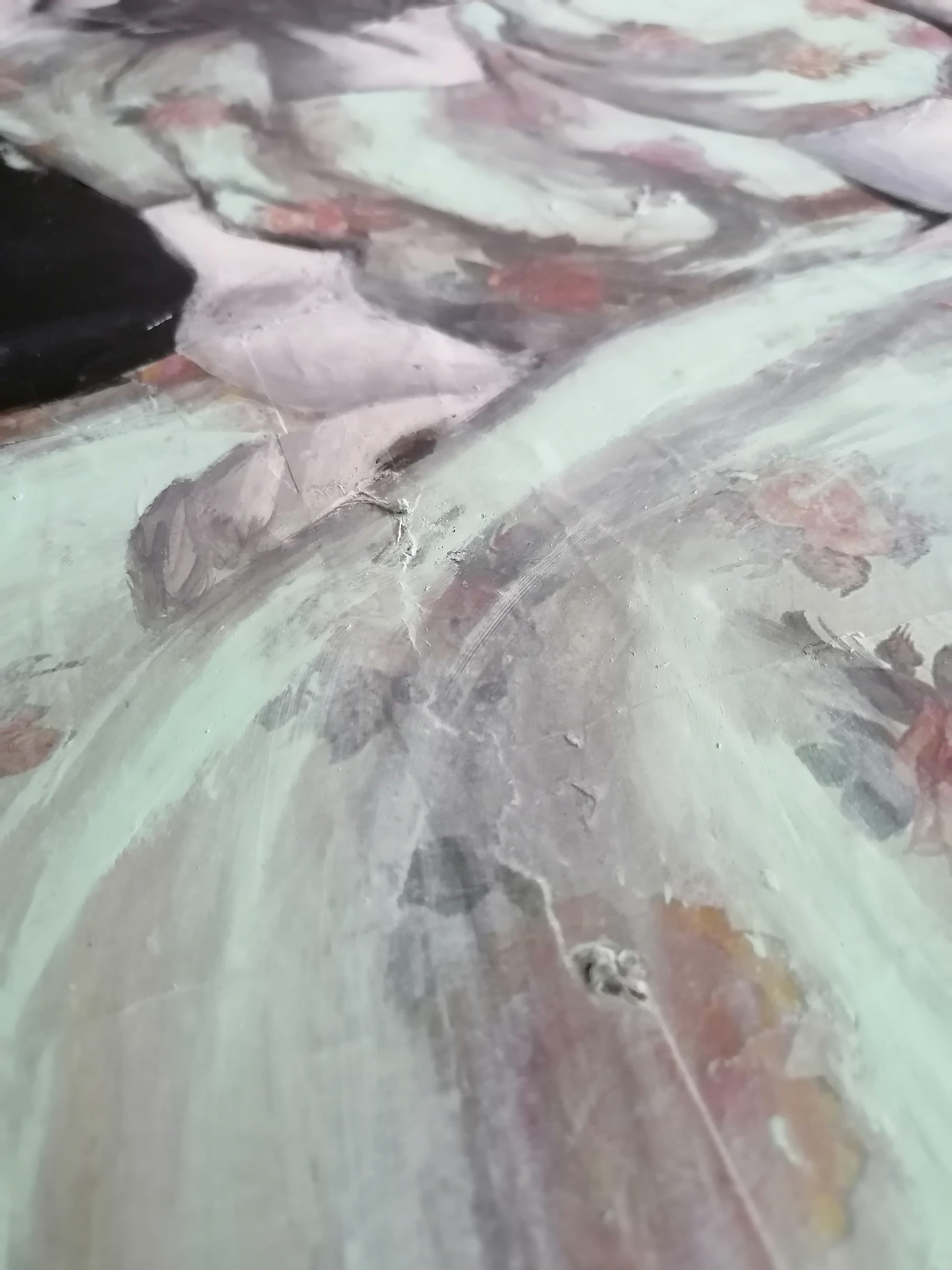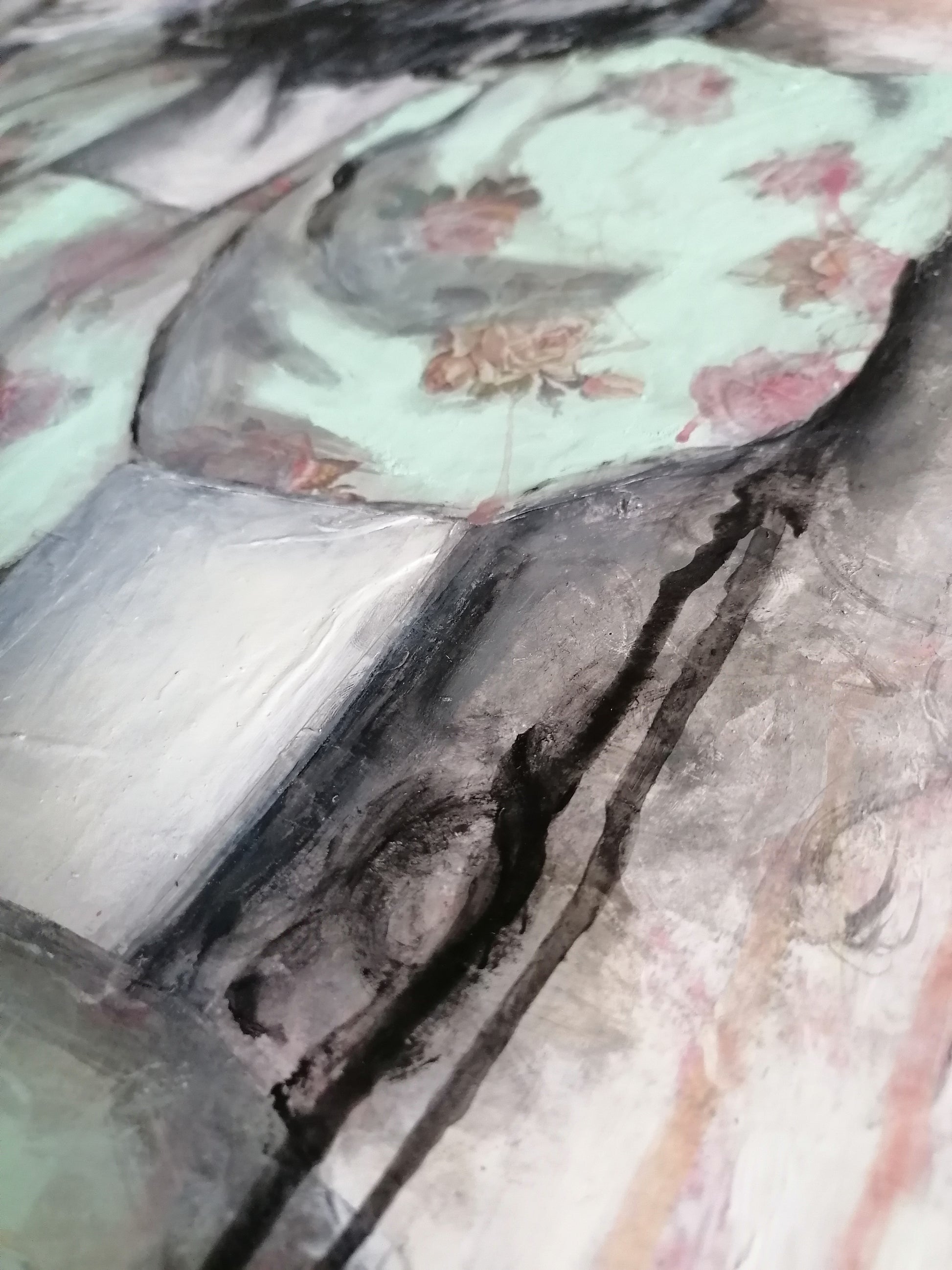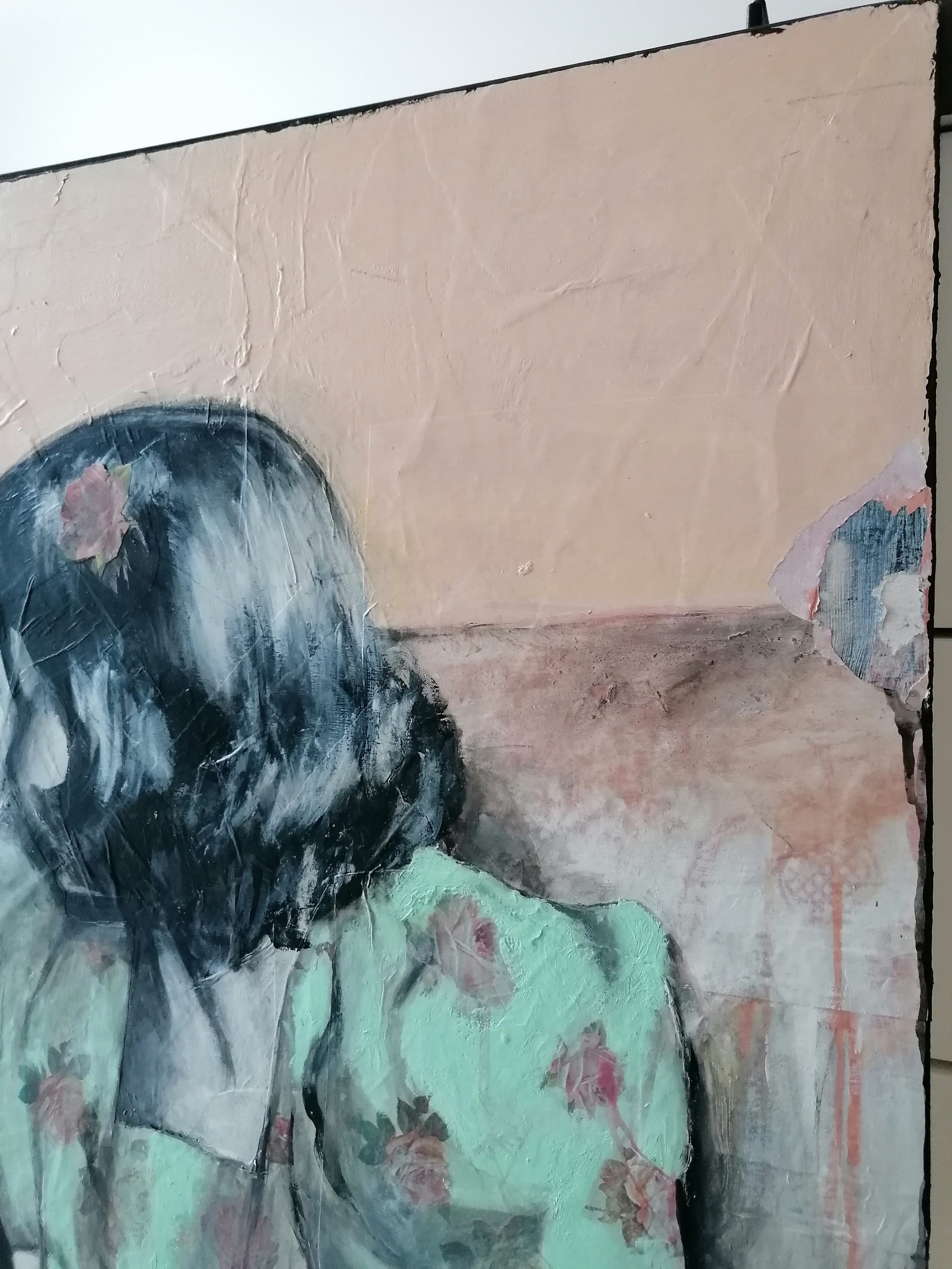 Una scena catturata in un momento privato. Due ragazzini alle prese con la loro prima cotta. Lo sguardo di lui è vivace e quasi malizioso, il volto di lei è coperto ma possiamo immaginarne l'espressione imbarazzata e timida dalle braccia giunte sulla gonna.